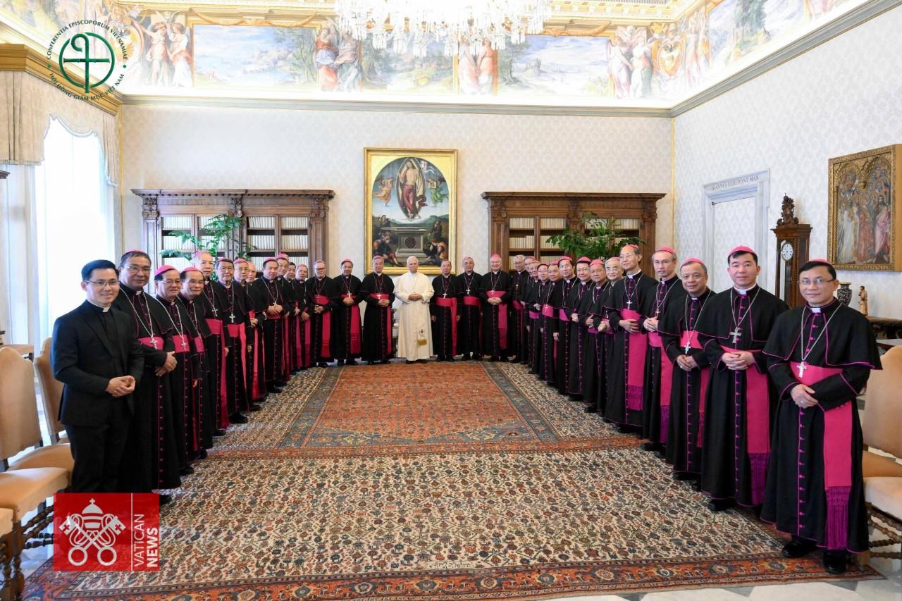 Lúc 10g30, các Đức Giám mục hân hoan bước vào Dinh Tông Toà để tiếp kiến Đức Thánh Cha. Vừa trở về sau chuyến tông du Phi châu, Đức Giáo hoàng niềm nở đón tiếp đoàn, ngài cho biết chính cuộc gặp gỡ với anh em giám mục đến từ Việt Nam đã tiếp thêm cho ngài sức mạnh, sự nâng đỡ và niềm vui.