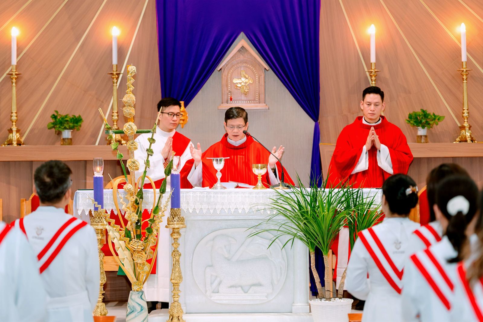 Sau cuộc rước, Thánh lễ Chúa nhật Lễ Lá được cử hành do Cha Giám đốc Trụ sở Giáo phận Thái Bình – miền Nam, cha Phêrô Verona Phạm Văn Nhật, chủ tế; cùng đồng tế có quý cha đang tu học tại Trụ sở và thầy phó tế. Mở đầu Thánh lễ, cha chủ tế mời gọi cộng đoàn không chỉ tưởng niệm một biến cố lịch sử, nhưng biết sống mầu nhiệm Lễ Lá trong hiện tại: đón nhận Đức Kitô vào tâm hồn và trung thành bước theo Người trên hành trình Vượt Qua – hành trình đi qua đau khổ để tiến tới vinh quang Phục Sinh.