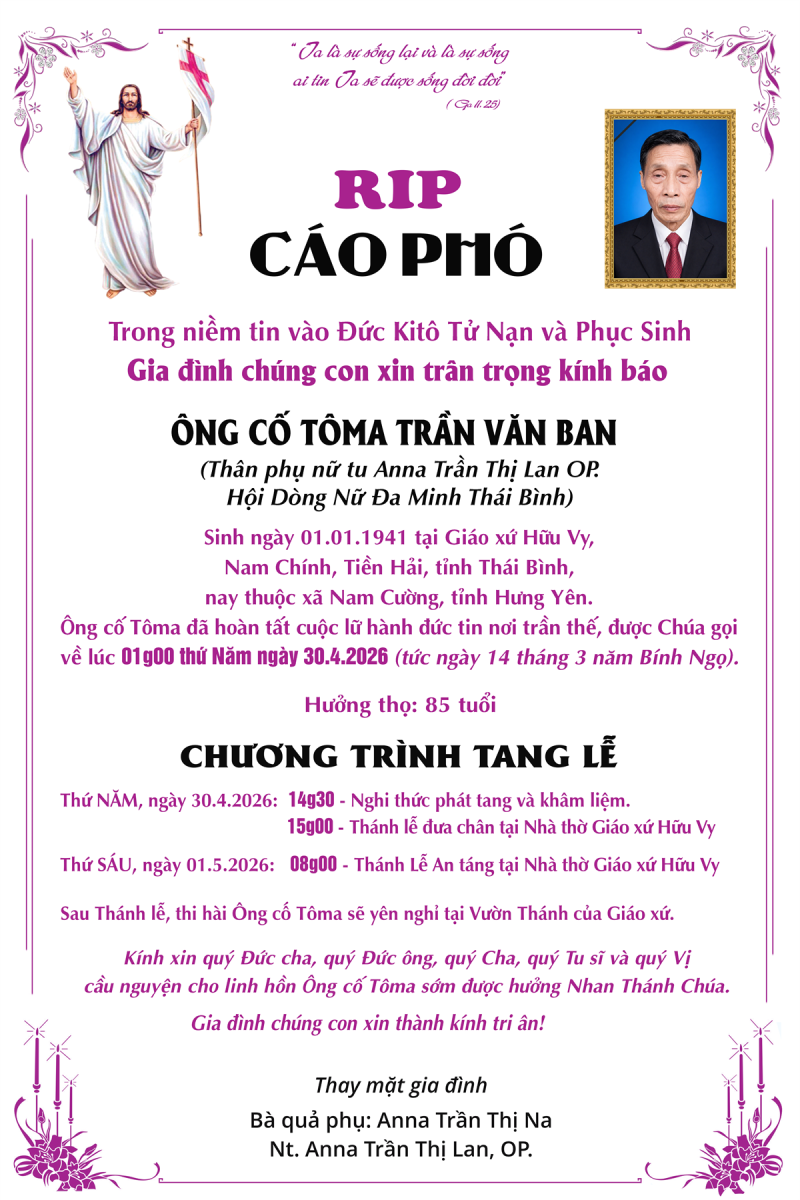 Trong niềm tin và hy vọng vào Chúa Ki-tô Phục Sinh, gia đình chúng con xin kính báo: Ông Cố Đa Minh Trần Văn Oanh, sinh năm 1969 tại Giáo xứ Đông Châu, đã được Chúa gọi về hồi 13g20 ngày 03/3/2026 (tức ...