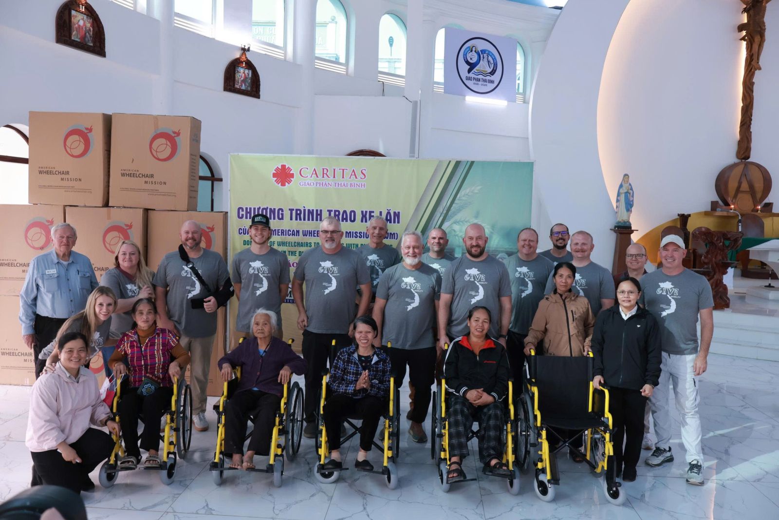 Từ sáng sớm, đoàn xuất phát từ Hà Nội gồm 02 xơ Caritas Việt Nam cùng 17 thành viên thuộc tổ chức American Wheelchair Mission (AWM) và Sam’s Furniture đã lên đường về Giáo phận Thái Bình. Không chỉ là những nhà tài trợ, các thành viên trong đoàn còn trực tiếp đồng hành, hỗ trợ người khuyết tật trong suốt chương trình trao tặng xe lăn.