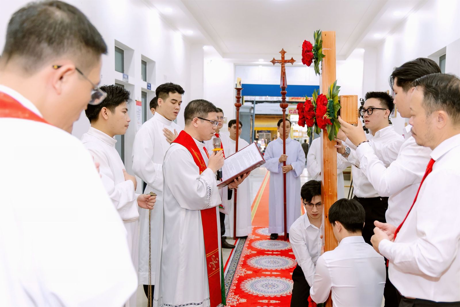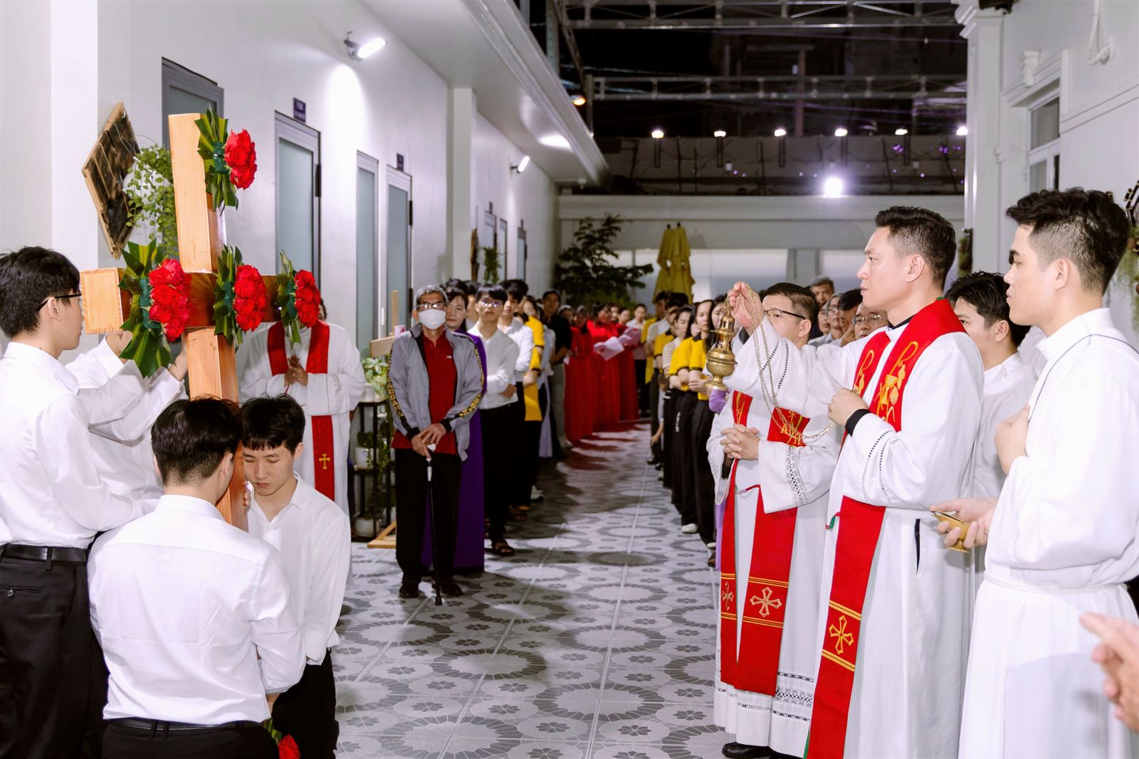 Vào lúc 19 giờ, nghi thức suy tôn Thánh Giá được cử hành cách long trọng. Cây Thánh Giá – biểu tượng của đau khổ nhưng cũng là dấu chỉ của tình yêu cứu độ – được nâng cao giữa cộng đoàn. Lời công bố “Đây là cây Thánh Giá, nơi treo Đấng Cứu Độ trần gian” vang lên đầy trang nghiêm, mời gọi cộng đoàn cúi mình tôn kính. Từng người lần lượt tiến lên hôn kính Thánh Giá trong sự thinh lặng sâu lắng. Cử chỉ đơn sơ nhưng đầy ý nghĩa ấy diễn tả lòng tin, sự biết ơn và ước muốn gắn bó với Đức Ki-tô chịu đóng đinh. Trong giây phút linh thiêng này, mỗi người như được mời gọi đặt những gánh nặng đời mình dưới chân thập giá, để kín múc sức mạnh từ tình yêu tự hiến của Chúa.