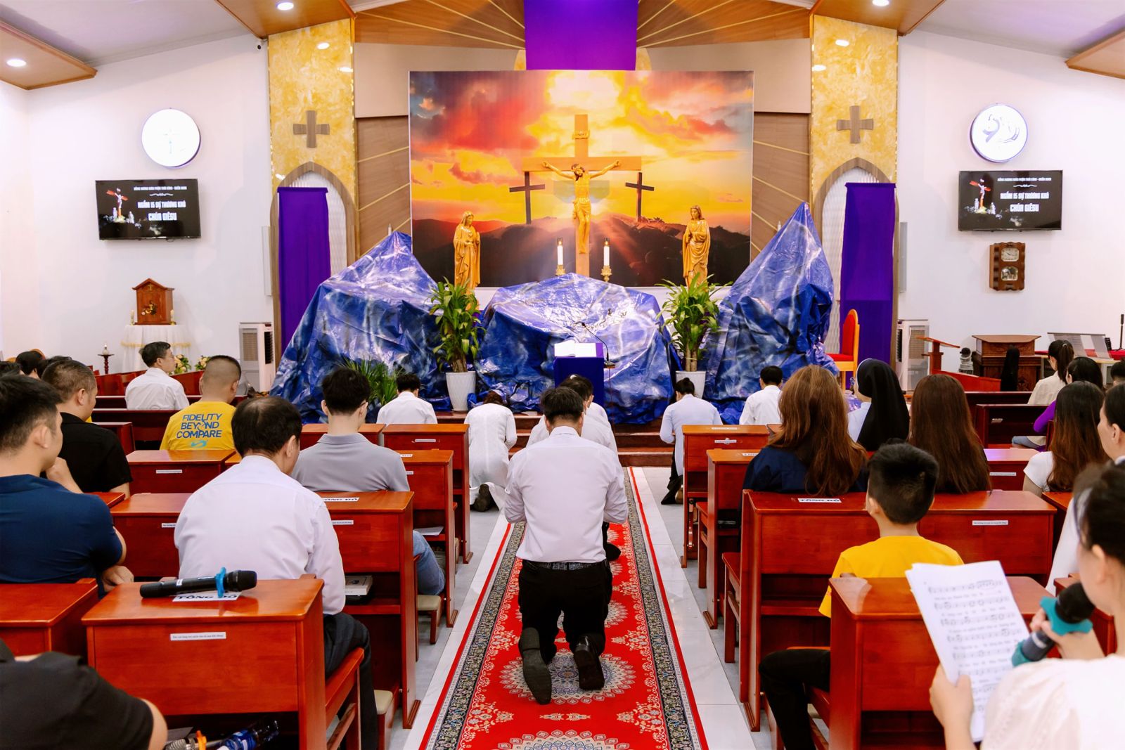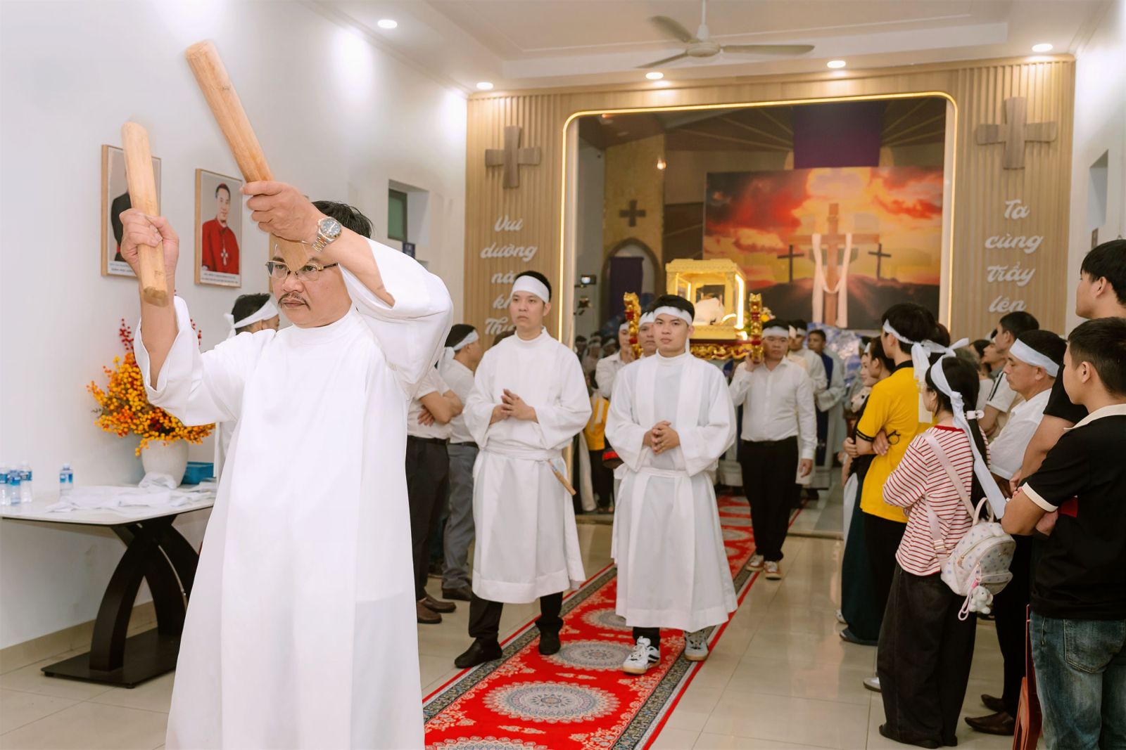 Ngay từ chiều, đông đảo bà con giáo dân – đặc biệt là những người con di dân của Giáo phận Thái Bình đang sinh sống và học tập tại miền Nam – đã hiện diện đông đủ để cùng nhau bước vào hành trình tưởng niệm cuộc khổ nạn của Chúa. Không khí thinh lặng, trang nghiêm bao trùm, giúp mỗi người lắng đọng tâm hồn, chuẩn bị bước vào những giờ phút thiêng liêng của ngày thứ Sáu Tuần Thánh.