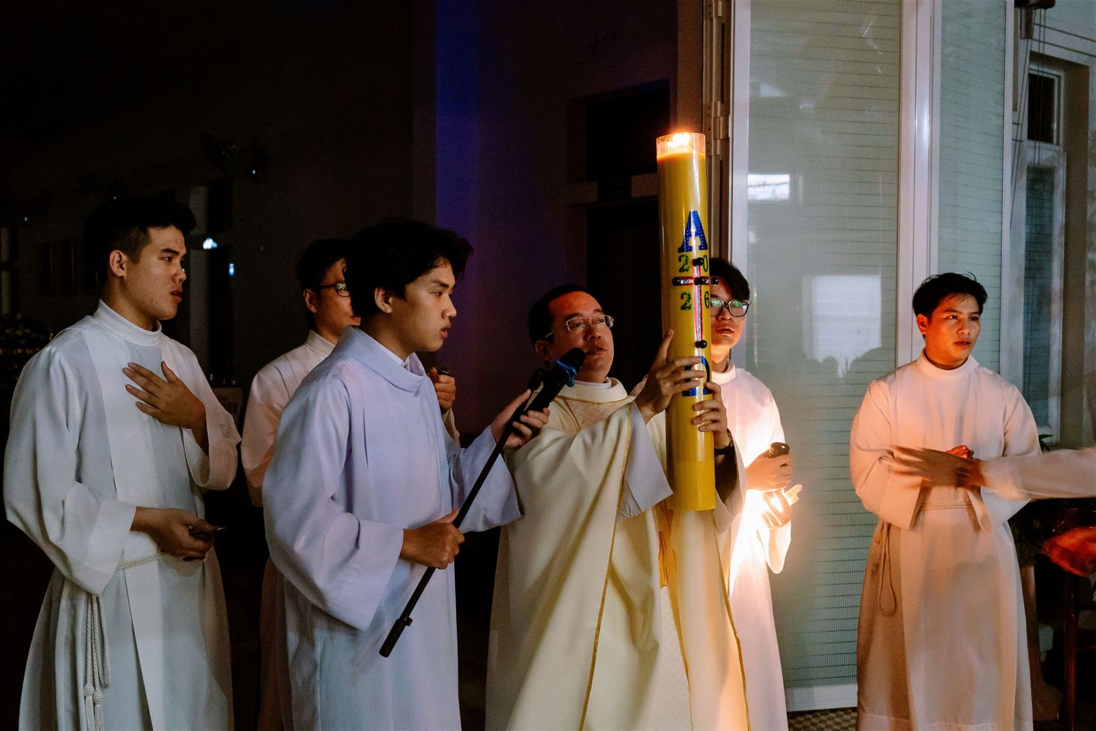 Cao điểm của đêm canh thức bắt đầu lúc 20g00 với nghi thức làm phép lửa. Trong không gian tĩnh lặng của màn đêm, ngọn lửa mới được thắp sáng như dấu chỉ của Đức Kitô – Ánh sáng thế gian. Từ ngọn lửa ấy, cây Nến Phục Sinh được thắp lên và rước vào nhà thờ, ánh sáng dần lan tỏa khi cộng đoàn cùng truyền lửa cho nhau. Từng ánh nến nhỏ hòa vào nhau tạo nên một biển sáng lung linh, diễn tả hành trình từ bóng tối của sự chết đến ánh sáng của sự sống mới. Lời công bố “Ánh sáng Chúa Kitô” vang lên ba lần như lời khẳng định: ánh sáng Phục sinh đang chiếu rọi vào thế giới và vào chính tâm hồn mỗi người.