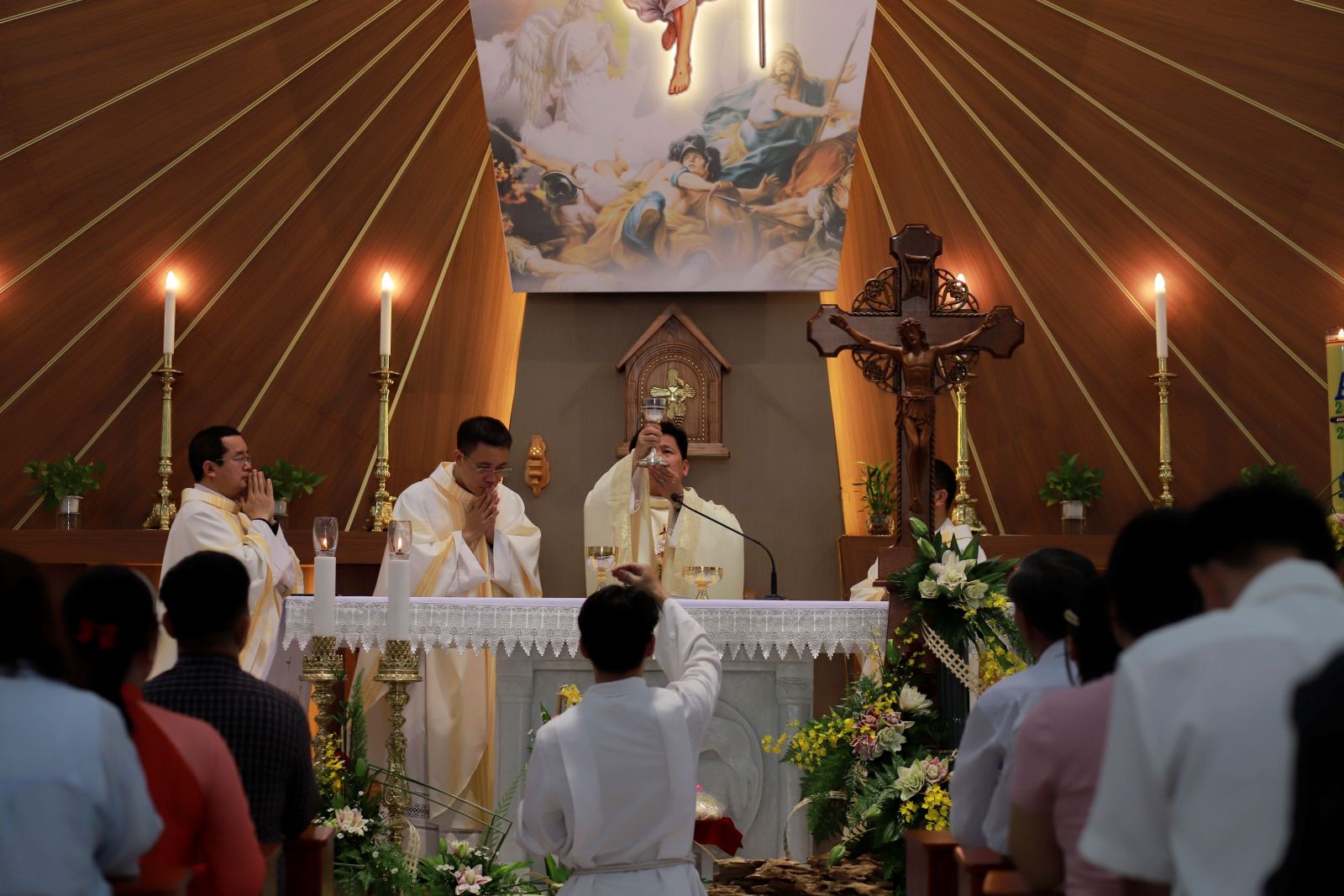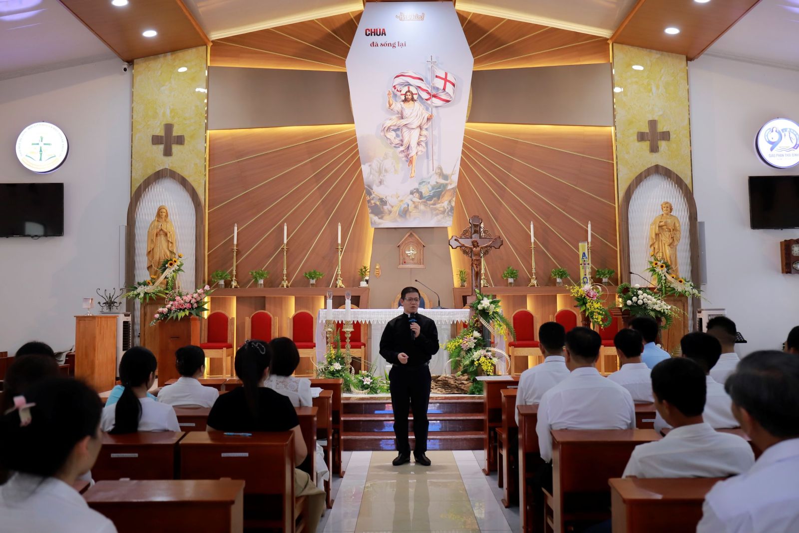 Vào lúc 15g30, Thánh lễ mừng kính Thánh quan thầy được cử hành do cha xứ Thuận Nghiêp Gioan Baotixita, cha quý hương và quý cha đang học tập tại Trụ sở đồng tế. Trong phần chia sẻ lời Chúa, cha Phaolo Nguyễn Văn Liêm mời gọi cộng đoàn chiêm ngắm các môn đệ trong bối cảnh sau Phục Sinh. Từ những con người nhát đảm, sợ hãi và mất hy vọng, cuộc gặp gỡ với Chúa Phục Sinh đã biến đổi họ hoàn toàn. Hình ảnh Thánh Tôma đặt tay vào lỗ đinh và cạnh sườn Chúa không chỉ là minh chứng cho đức tin non yếu mà còn là bài học về sự chạm đến lòng thương xót. Cha mời gọi mỗi người không chỉ gặp Chúa qua hình ảnh thể lý mà còn gặp Ngài qua đời sống cộng đoàn, qua Lời Chúa và đặc biệt là trong Bí tích Thánh Thể để được biến đổi mỗi ngày. Bên cạnh mầu nhiệm Phục Sinh, cha Phaolo nhấn mạnh đến gương sáng của Thánh Vinh Sơn – vị quan thầy của cộng đoàn. Thánh nhân được nhắc đến như “thiên thần rao giảng” với hình ảnh ngón tay chỉ lên trời và đôi cánh loan báo Tin Mừng. Thánh nhân đánh thức lương tâm và hướng con người về niềm hy vọng cánh chung. Qua đó, cha nhắn nhủ cộng đoàn đồng hương, dù ở nơi xa quê, hãy luôn mang trong mình ngọn lửa đức tin bừng cháy, sống tinh thần bác ái và trở thành những chứng nhân sống động của lòng thương xót Chúa giữa đời thường.