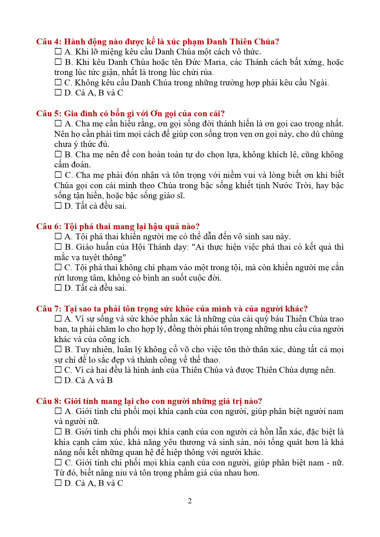 Ban Giáo lý Đức Tin GPTB: Hân hạnh giới thiệu ĐỀ THI HỌC KỲ 1 - Dành cho lớp Huấn luyện GLV Cấp 2 (Đề số 2)