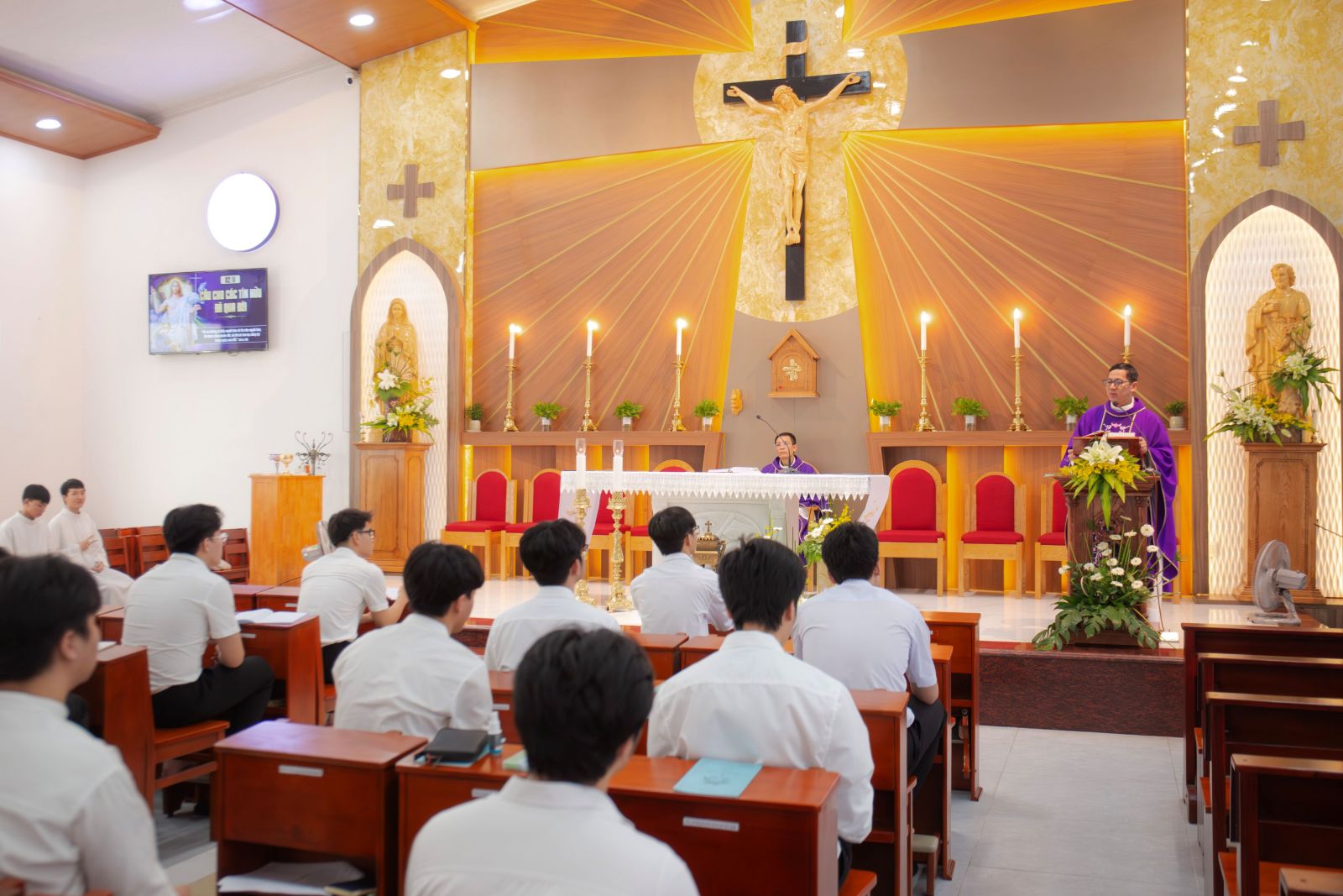 Đỉnh cao của buổi tĩnh tâm là Thánh lễ trọng thể cầu nguyện cho các Đẳng Linh Hồn do cha Đặc trách Giu-se chủ tế. Trong bài giảng, cha Gio-an mời gọi anh em cầu nguyện đặc biệt cho các linh hồn đang được thanh luyện, đồng thời nhấn mạnh rằng “cầu nguyện cho các linh hồn là một khoản đầu tư không bao giờ lỗ”, bởi đó là hành vi của Đức tin, của tình yêu thương, bác ái, nối kết giữa Hội thánh Lữ Hành và Hội thánh Thanh Luyện.