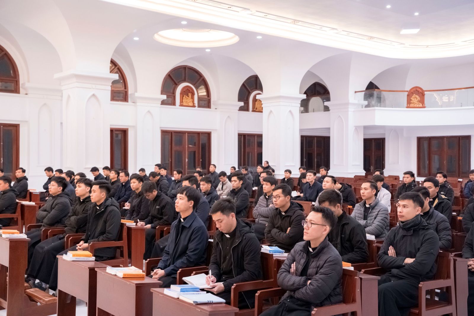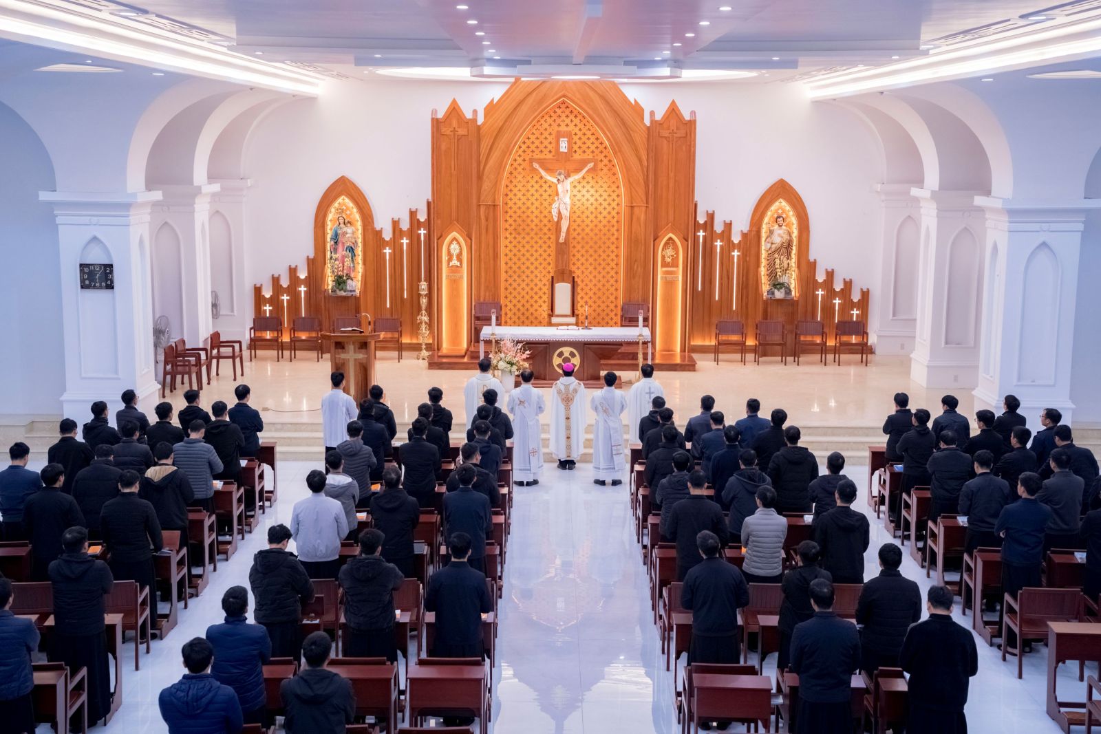 Sáng ngày 24/01/2026, Đức cha Đaminh đã chủ tế Thánh lễ tại nguyện đường Đại Chủng viện. Trong bài giảng, dựa trên mẫu gương vua Đavít và Thánh Phanxicô Salêsiô, Đức cha tiếp tục mời gọi anh em sống và thực hành bốn nhân đức căn bản đã được chia sẻ. Qua đó, ngài nhấn mạnh rằng con đường nên thánh và trưởng thành trong ơn gọi linh mục chính là con đường khiêm nhường, hiền hòa, kiên nhẫn và đầy lòng bác ái.