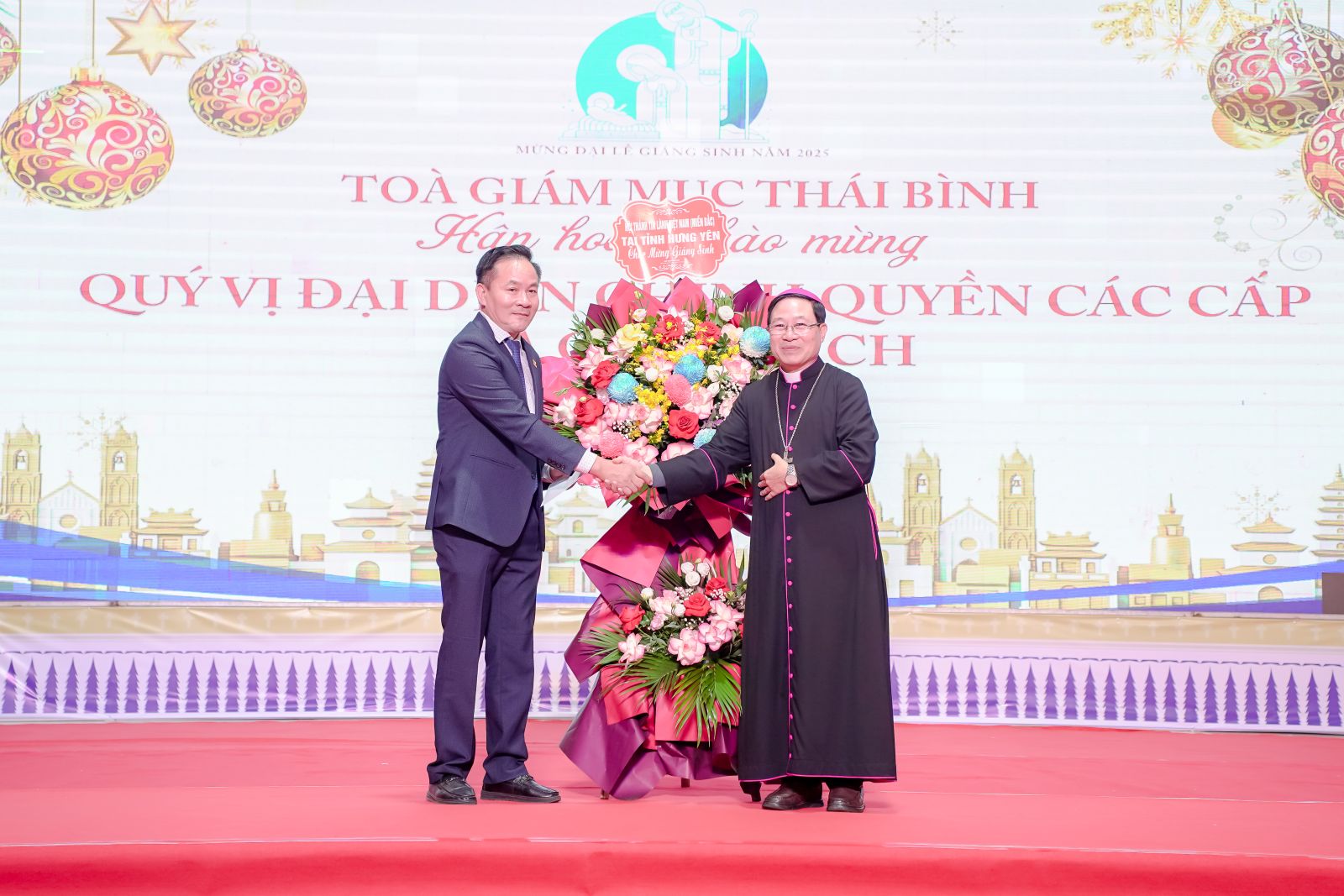 Trong buổi gặp gỡ thân tình, ông Nguyễn Hữu Nghĩa – Bí thư Tỉnh ủy tỉnh Hưng Yên, thay mặt lãnh đạo tỉnh đã gửi lời chúc Giáo phận đón mừng một mùa Giáng Sinh an lành, hạnh phúc và tràn đầy hồng ân Thiên Chúa, đồng thời thông tin một số kết quả nổi bật trong phát triển kinh tế – xã hội của tỉnh trong thời gian qua. Ông cũng ghi nhận và đánh giá cao những đóng góp tích cực của đồng bào Công giáo trong toàn giáo phận đối với sự phát triển chung của địa phương. Thay mặt lãnh đạo tỉnh, ông đã bày tỏ mong muốn Giáo phận Thái Bình tiếp tục đồng hành cùng chính quyền địa phương, phát huy tinh thần “tốt đời, đẹp đạo”, tích cực tham gia các phong trào thi đua yêu nước, góp phần xây dựng xã hội ngày càng phát triển, văn minh.
