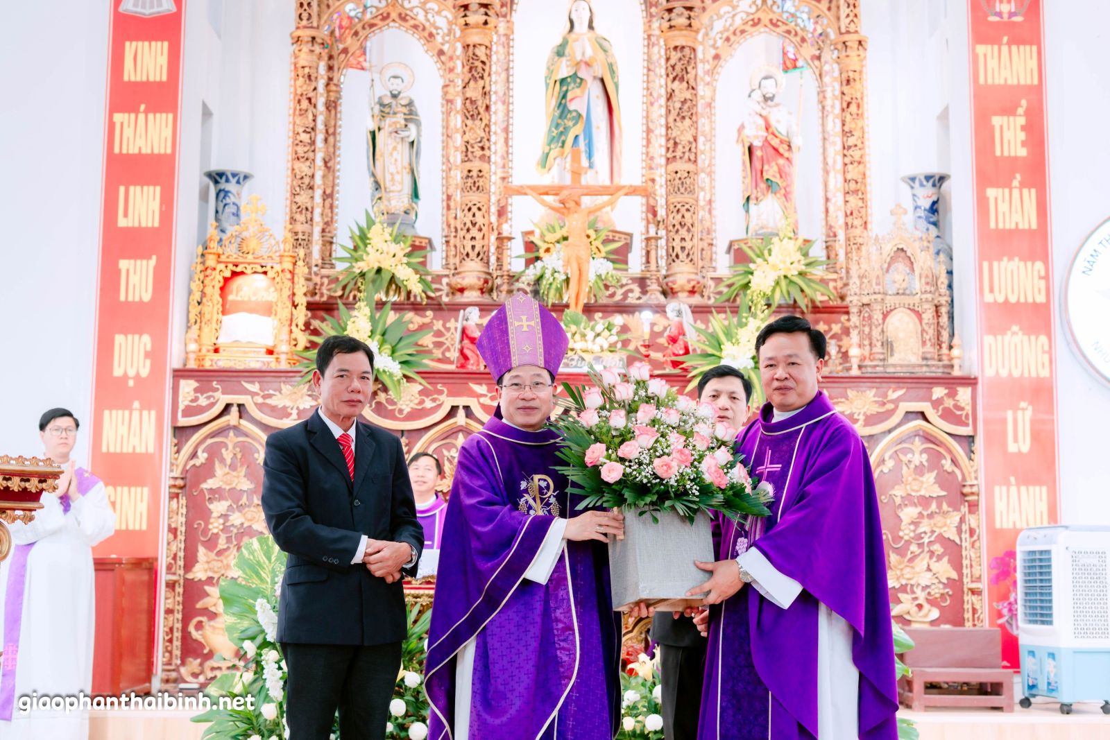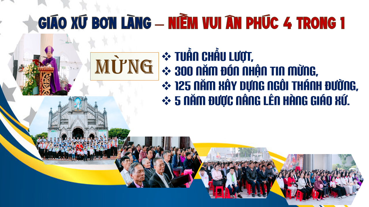 Thánh lễ kết thúc trong niềm vui tạ ơn và hiệp nhất. Hành trình 300 năm đón nhận Tin Mừng, 125 năm xây dựng ngôi Thánh đường, 5 năm được nâng lên hàng giáo xứ - Tất cả đều là dấu ấn của tình yêu và hy vọng mà Thiên Chúa đã trao ban. Nhờ lời chuyển cầu của Đức Mẹ Mân Côi quan thầy giáo xứ, hai Hiền Phúc Tử Đạo, nguyện xin Thiên Chúa tiếp tục tuôn đổ hồng ân, gìn giữ và hướng dẫn, để Giáo xứ để Bơn Làng luôn là một cộng đoàn vững vàng trong đức tin, phong phú trong đức ái và bền bỉ trong niềm hy vọng, xứng đáng với hồng ân mà Thiên Chúa đã trao ban.