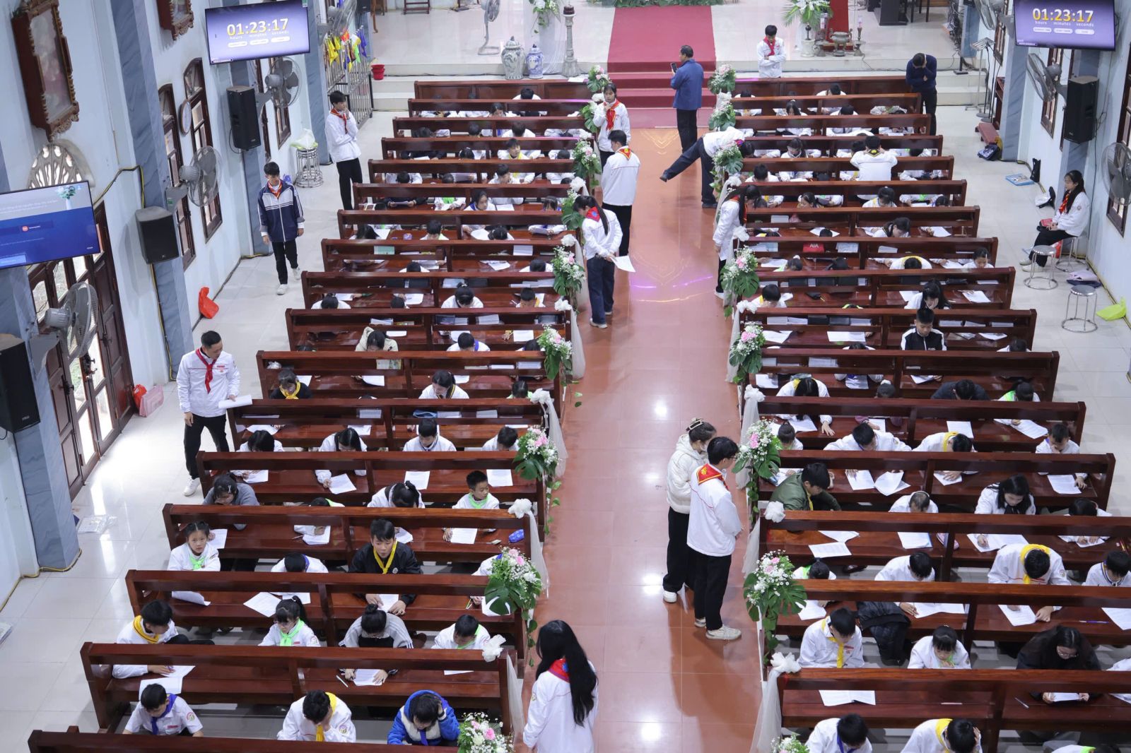 Sau phần khai mạc, các em thiếu nhi bước vào giờ làm bài trong bầu khí trang nghiêm, trật tự và nghiêm túc. Hình ảnh các em cúi đầu chăm chú trên từng trang giấy, từng nét chữ nắn nót, không chỉ phản ánh sự cố gắng học tập của các em, mà còn cho thấy sự kiên trì, tận tụy và yêu thương của cha xứ, thầy phó tế, quý thầy cô giáo lý viên trong suốt thời gian qua.