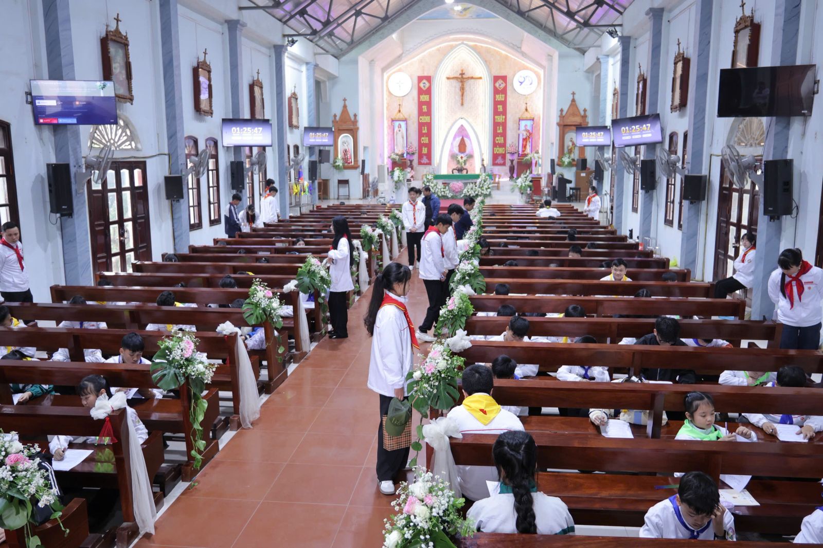 Ngay từ đầu giờ chiều, khuôn viên nhà thờ Giáo xứ Đức Ninh trở nên rộn ràng và ấm áp. Các em thiếu nhi trong trang phục chỉnh tề, quy tụ đông đủ với tâm thế vừa hồi hộp, vừa háo hức bước vào giờ thi. Kỳ thi không chỉ là dịp để đánh giá kiến thức giáo lý, mà còn là cơ hội để các em nhìn lại hành trình học hỏi và sống đức tin của mình trong suốt thời gian qua.