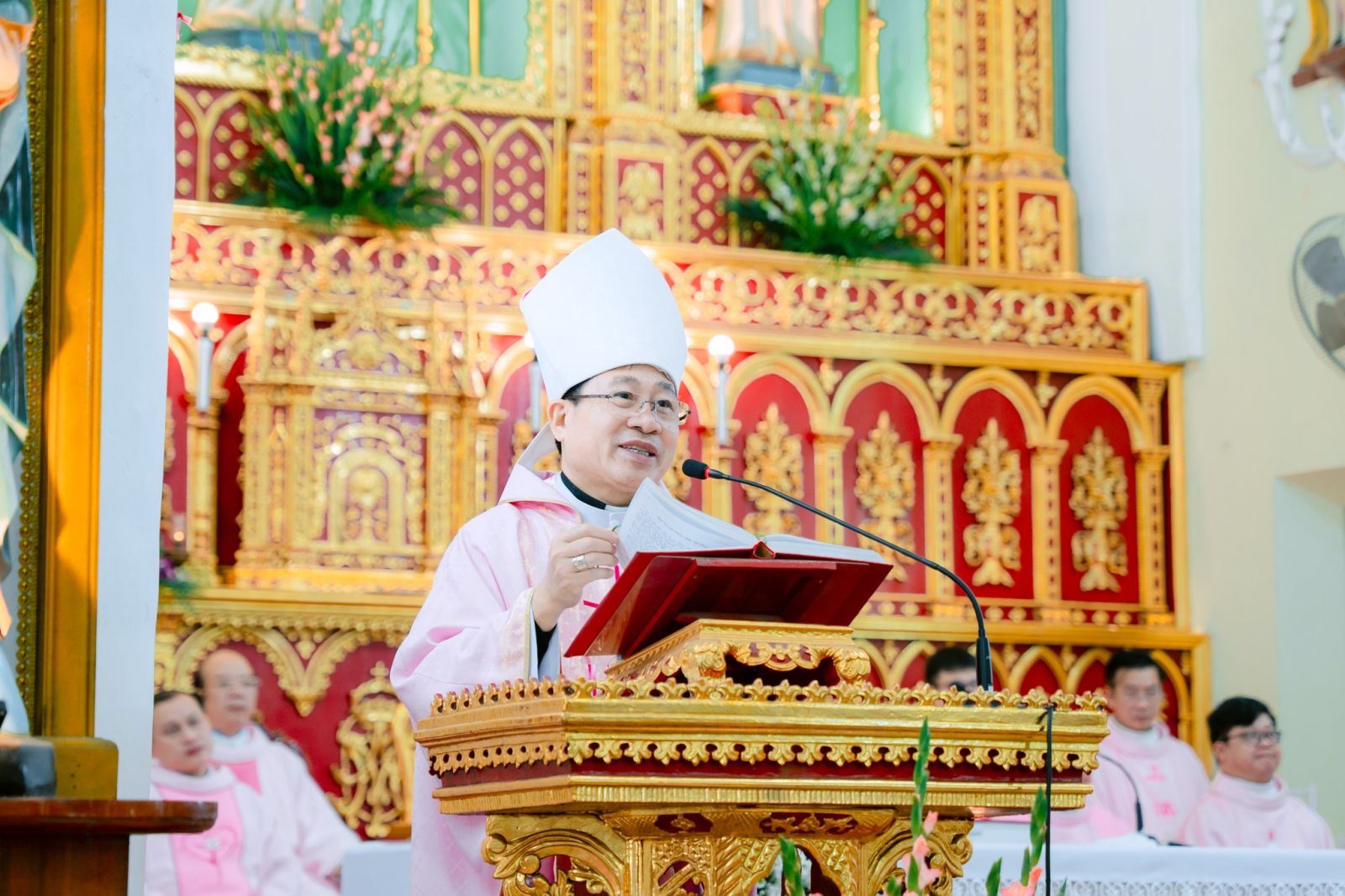 Trong bài giảng, Đức Cha đã giải thích ý nghĩa của màu hồng trong phụng vụ, được sử dụng trong Chúa Nhật IV Mùa Chay và Chúa Nhật III Mùa Vọng, như dấu chỉ của niềm vui và hy vọng giữa hành trình sám hối. Suy niệm Tin Mừng Chúa Giêsu chữa lành người mù, Đức Cha mời gọi cộng đoàn nhận ra rằng không chỉ người mù trong Tin Mừng cần được chữa lành, nhưng mỗi người chúng ta cũng cần được Chúa chữa khỏi sự “mù lòa thiêng liêng”, để có thể nhận ra tình yêu và sự hiện diện của Thiên Chúa trong đời sống. Đức Cha nhấn mạnh: sau khi được chữa lành, người mù đã can đảm tuyên xưng đức tin và làm chứng cho Chúa. Đó cũng là lời mời gọi dành cho mỗi Kitô hữu hôm nay: sau khi cảm nghiệm được tình yêu của Thiên Chúa, chúng ta được mời gọi đứng lên trở nên ánh sáng cho người khác như lời mời gọi của Hội đồng Giám mục dành cho cộng đoàn dân Chúa trong năm nay. Đây cũng chính là lời mời gọi của Thánh Phaolô trong thư gửi tín hữu Êphêsô trong bài đọc II của phụng vụ Lời Chúa hôm nay: “Anh em hãy sống như con cái ánh sáng” (Ep 5,8). Đức Cha nhắc nhở mỗi người tín hữu hãy trở nên những ngọn nến nhỏ trong tay Chúa, thắp lên ánh sáng của niềm vui, hy vọng, tình yêu và lòng nhân ái cho gia đình, giáo hội và xã hội.