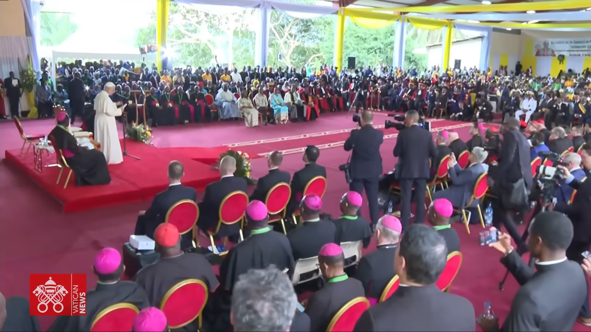 Trong diễn văn chào mừng, Giáo sư Viện trưởng Thomas Bienvenu Tchoungui nhấn mạnh: “Trường Đại học này là một món quà ‘Từ Trái tim của Giáo hội’. Đây là trường đại học của Đức Thánh Cha. Vì vậy, Ngài đang ở đây, tại chính ngôi nhà của mình”.