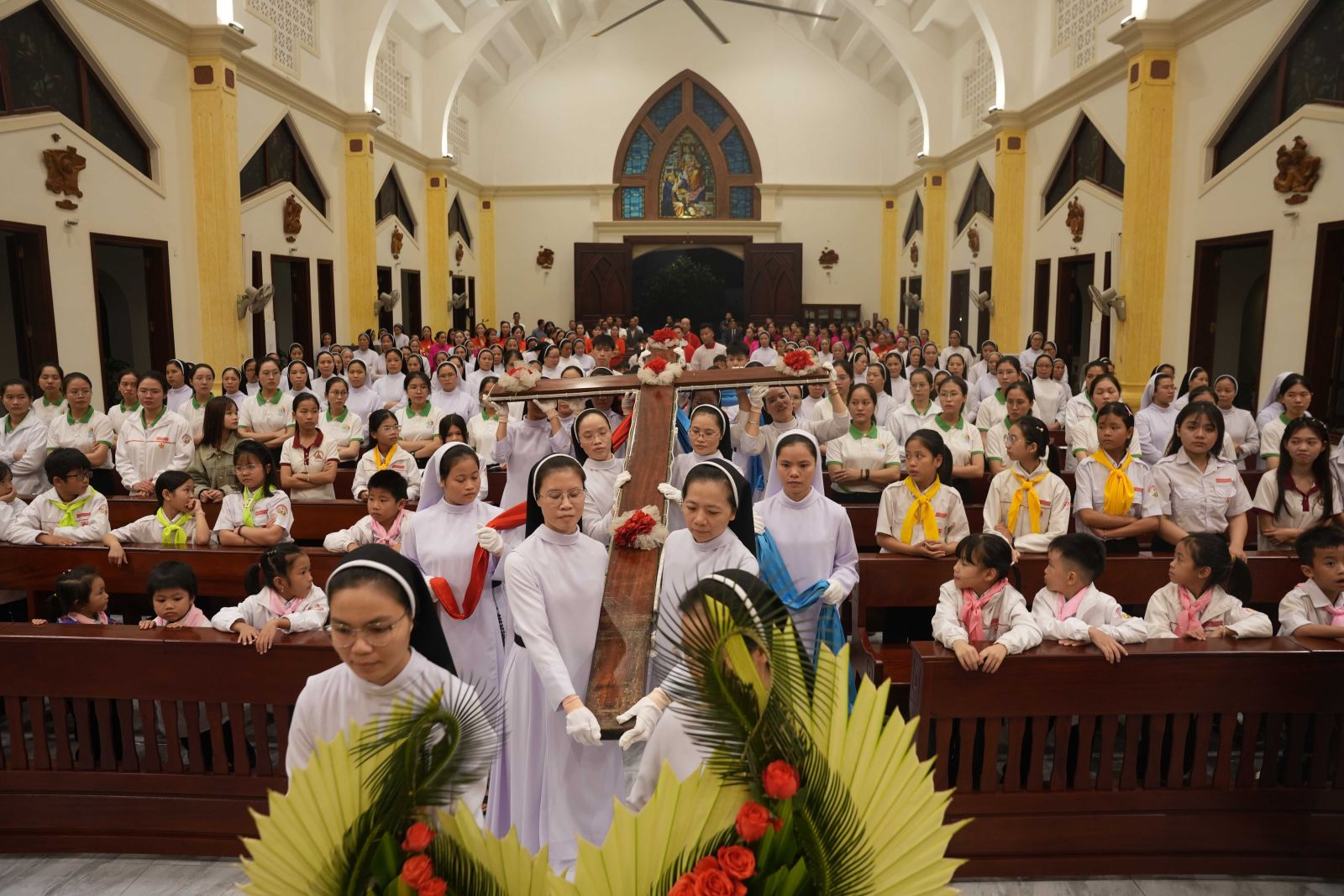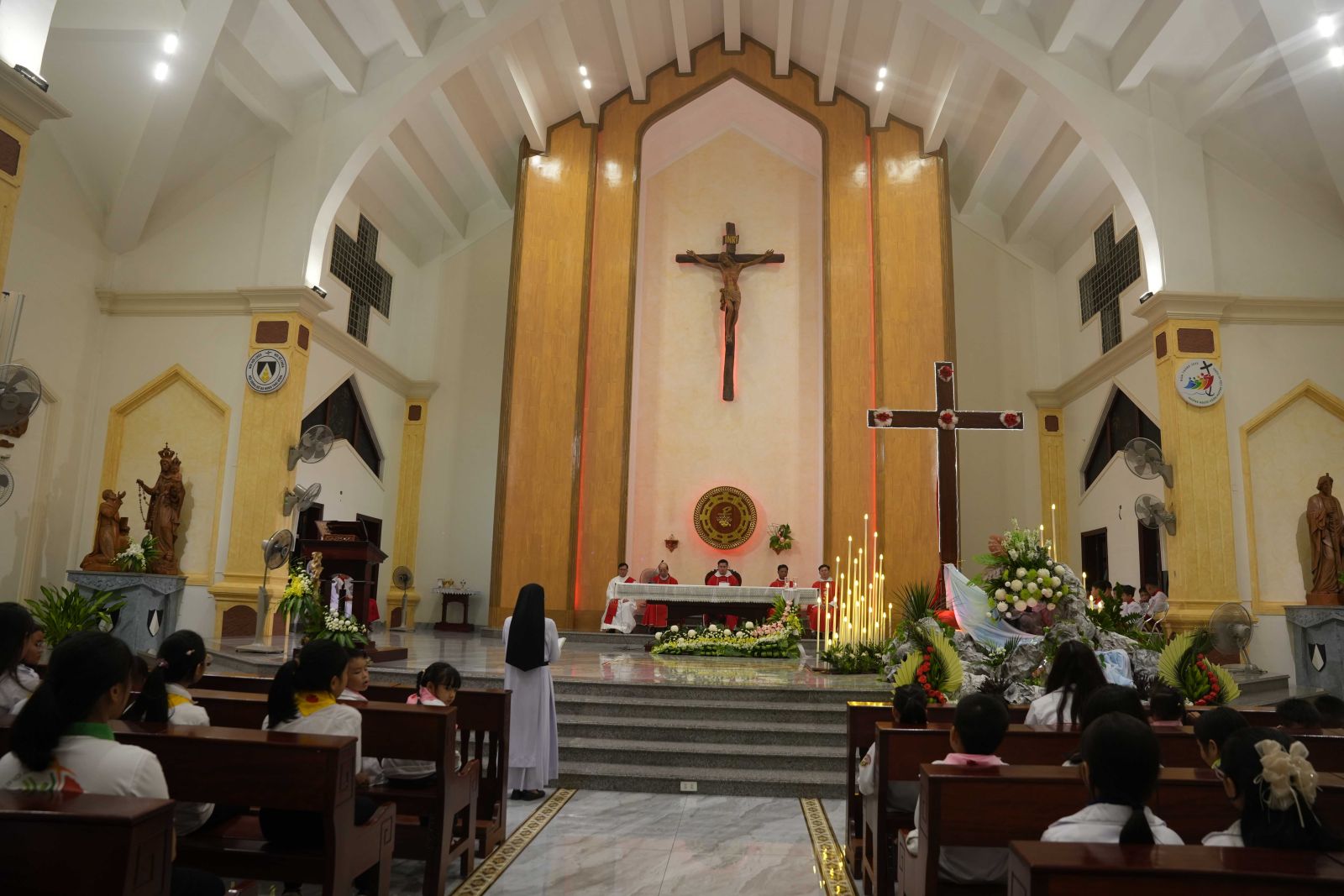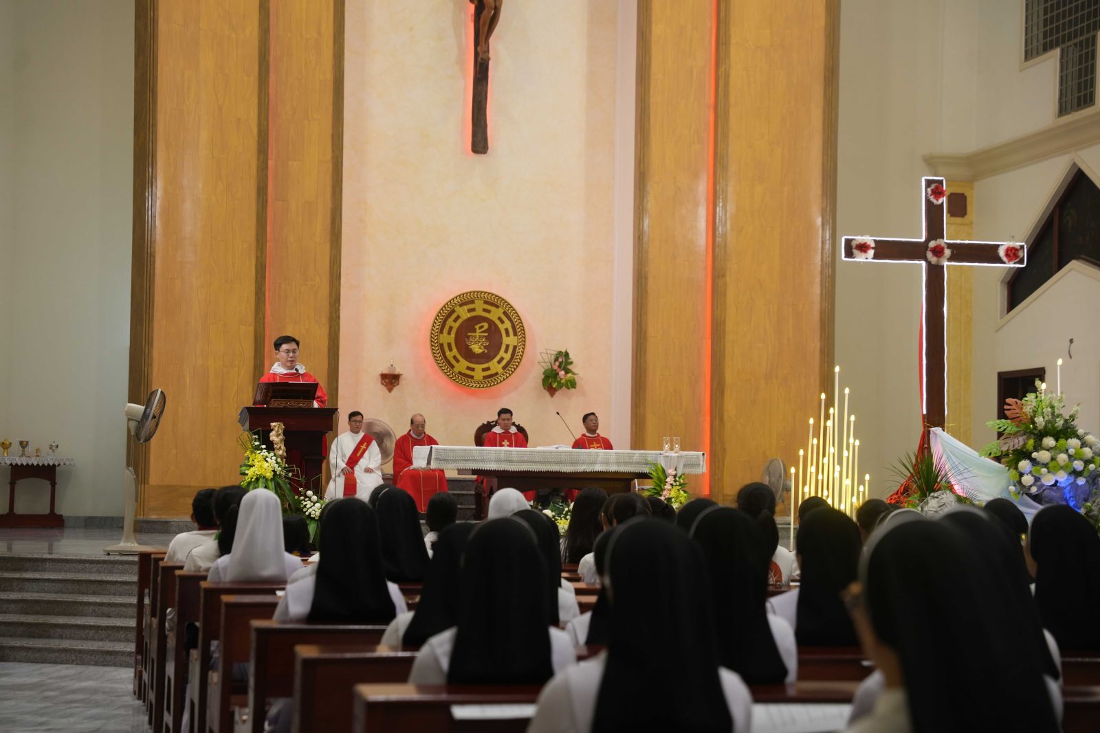 20g00, đoàn rước tiến vào cung thánh để bước vào Thánh lễ suy tôn Thánh Giá, do cha Giuse Nguyễn Văn Giới, O.P. chủ tế và cha Giuse Trần Văn Thiên, O.P. giảng lễ. Đồng tế có quý cha giáo thuộc Tỉnh Dòng Đa Minh Việt Nam, cùng quý thầy, quý chị em, thiếu nhi, giới trẻ và đông đảo bà con giáo dân. Bầu khí phụng vụ thật linh thiêng, chan chứa tình gia đình, và tràn đầy lòng tri ân vì được đón nhận ân huệ cao quý này.