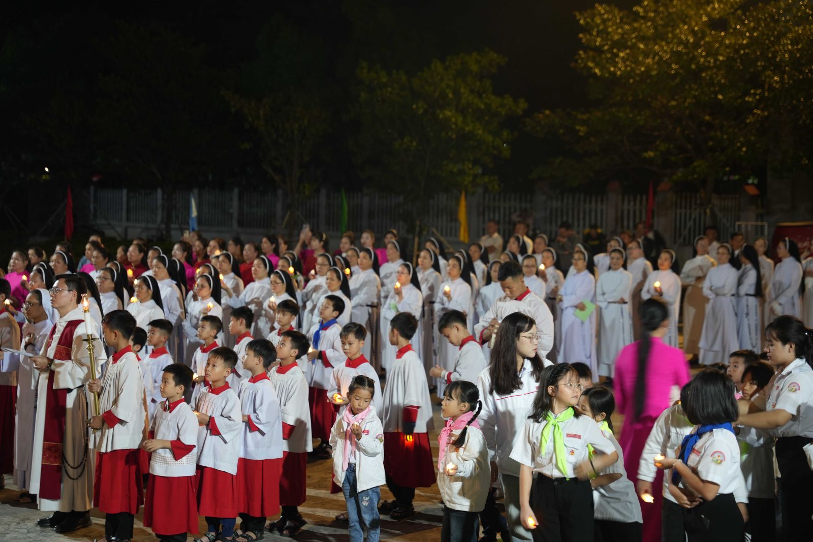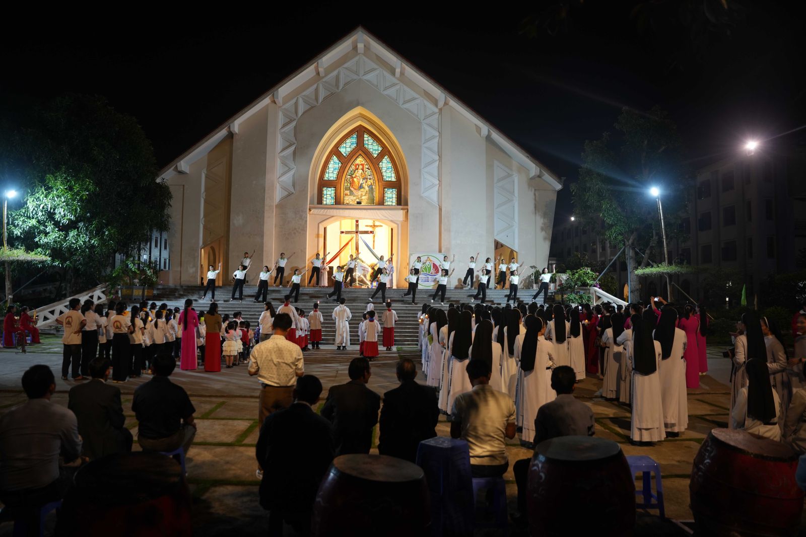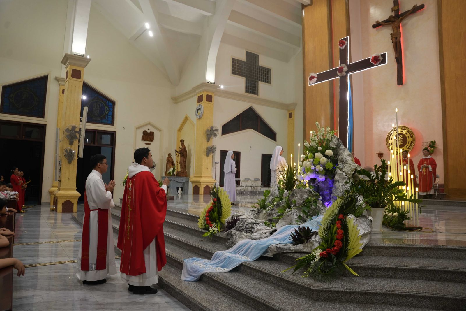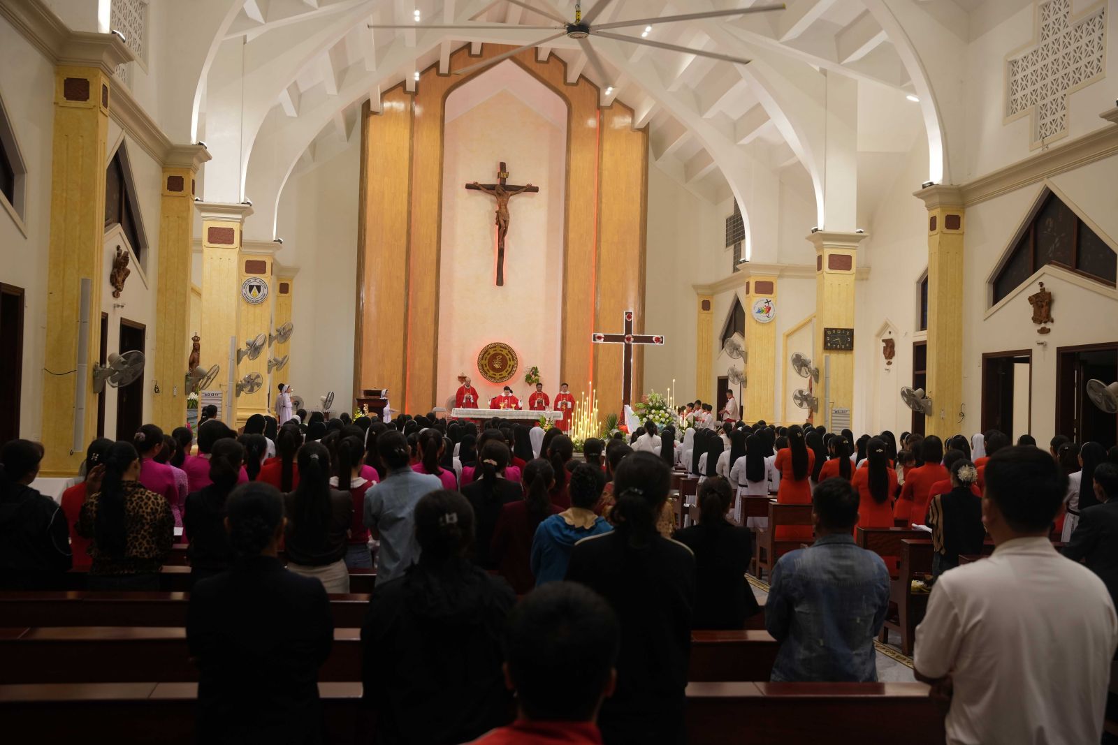 20g00, đoàn rước tiến vào cung thánh để bước vào Thánh lễ suy tôn Thánh Giá, do cha Giuse Nguyễn Văn Giới, O.P. chủ tế và cha Giuse Trần Văn Thiên, O.P. giảng lễ. Đồng tế có quý cha giáo thuộc Tỉnh Dòng Đa Minh Việt Nam, cùng quý thầy, quý chị em, thiếu nhi, giới trẻ và đông đảo bà con giáo dân. Bầu khí phụng vụ thật linh thiêng, chan chứa tình gia đình, và tràn đầy lòng tri ân vì được đón nhận ân huệ cao quý này.