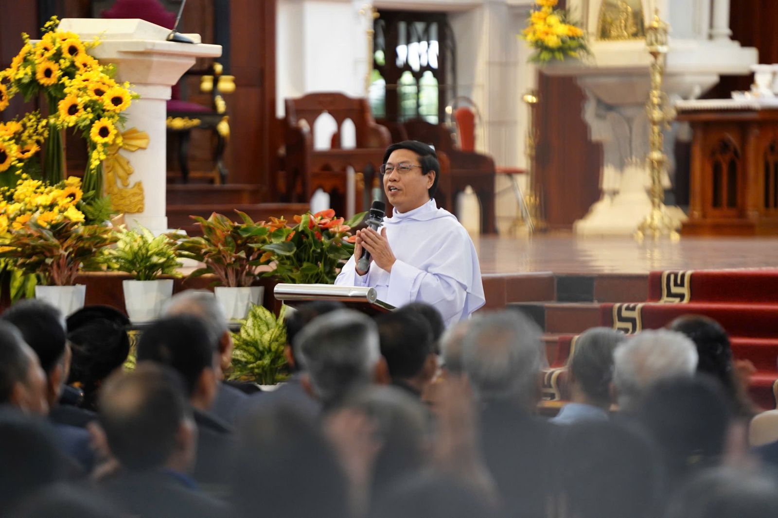 Chia sẻ trong lời đầu lễ cũng như bài giảng, Đức cha Đa-minh khai triển đoạn Tin mừng Mt 25, 31-46 với chủ đề ‘BÁC ÁI’: “Ta bảo thật các ngươi: mỗi lần các ngươi làm như thế cho một trong những anh em bé nhỏ nhất của Ta đây, là các ngươi đã làm cho chính Ta vậy” (Mt 25,40). Từ nền tảng Kinh Thánh, Đức cha dẫn dắt cộng đoàn nhìn vào mẫu gương của thánh Martino – Quan thầy, nhờ đó mỗi người cũng biết chuyên tâm phụng sự Chúa qua các giờ kinh phụng vụ, những việc thực hành việc đạo đức để cầu nguyện cho Giáo hội và thế giới; cùng thể hiện tấm lòng bác ái bằng những hành động cụ thể, yêu thương không tinh toán dành cho những người nghèo khổ, đau yếu cả về thể xác lẫn tinh thần trong xã hội.