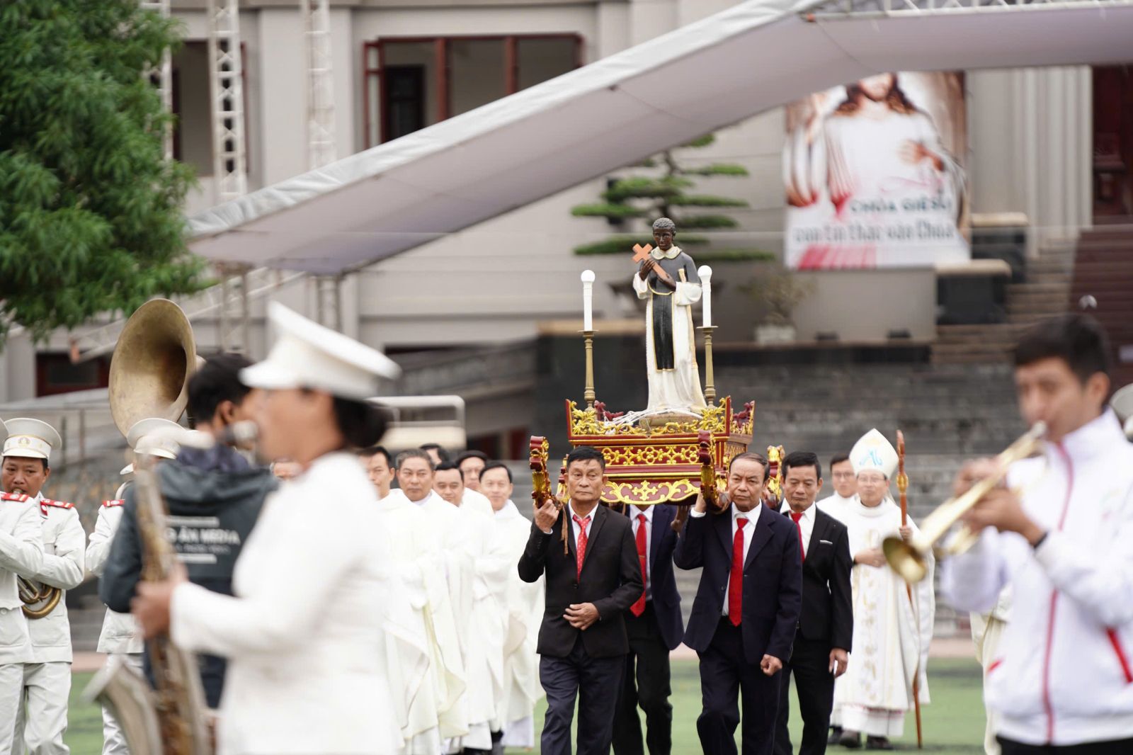 Đúng 09g00, đoàn đồng tế và kiệu thánh Quan thầy tiến bước từ quảng trường Tòa Giám mục vào nhà thờ hiệp dâng Thánh lễ tạ ơn.