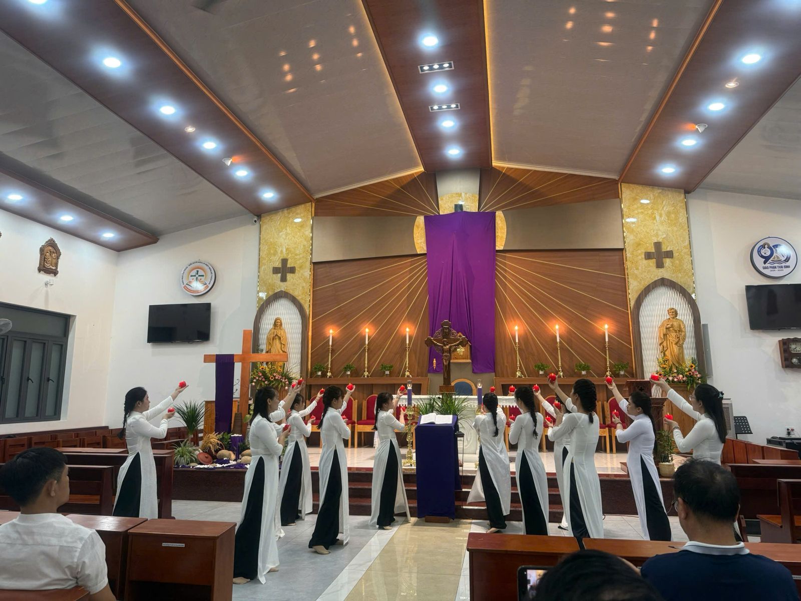 Khi phố vừa lên đèn, hoàng hôn khép lại cũng là lúc tôi bước vào nhà nguyện trong tâm thế lặng lẽ. Không gian bên trong khiến tôi chững lại bởi nét đơn sơ mà sâu lắng. Sắc tím Mùa Chay phủ nhẹ khắp gian thánh, những tiểu cảnh được sắp đặt giản dị bên ánh nến dịu dàng. Không còn những bình hoa rực rỡ, chỉ còn màu xanh khiêm nhường của những chậu cây nhỏ bé. Nổi bật giữa không gian tĩnh lặng ấy là hình ảnh Chúa Giêsu chịu đóng đinh – biểu tượng của tình yêu tự hiến âm thầm mà cao cả. Tất cả hòa quyện tạo nên một bầu khí linh thiêng, giúp tâm hồn tôi lắng xuống và cảm nhận sự bình an sâu xa.