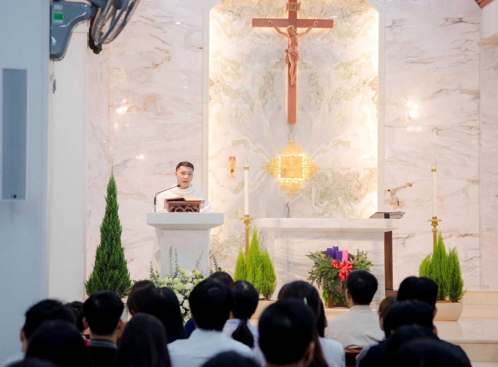 Trong bài giảng lễ, cha Đa-minh tha thiết mời gọi mỗi sinh viên hãy tỉnh thức và cầu nguyện, bởi giữa muôn cám dỗ nơi thành phố phồn hoa, tâm hồn dễ xa rời Thiên Chúa thì Đức tin chính là điểm tựa vững vàng vượt qua mọi nguy biến, khó khăn. Cha khuyến khích các bạn biết giữ lấy những giá trị tinh tuyền như Mẹ Maria: vững mạnh trong Đức tin, khiêm nhường, và luôn đặt Thiên Chúa là trung tâm của cuộc sống.
