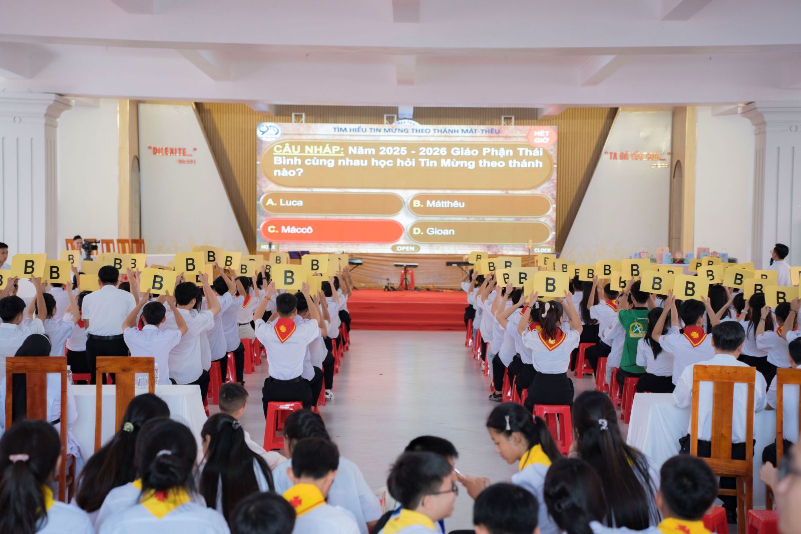 Buổi chiều diễn ra phần thi Giáo lý và Tin Mừng theo Thánh Mátthêu dưới hình thức “Rung chuông vàng”. Các bạn trẻ tham gia cách nhiệt tình, thể hiện tinh thần ham học hỏi Lời Chúa - theo lời kêu gọi cũng như sự hướng dẫn của Đức Cha Giáo phận. Đây là dịp giúp củng cố kiến thức đức tin và khơi dậy lòng yêu mến Kinh Thánh nơi người trẻ.