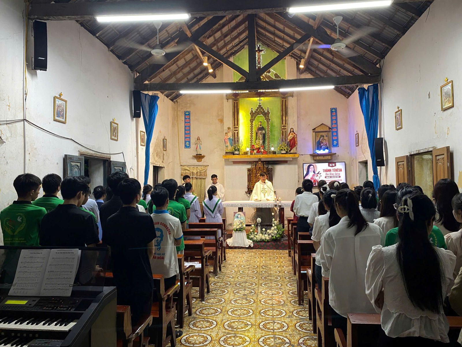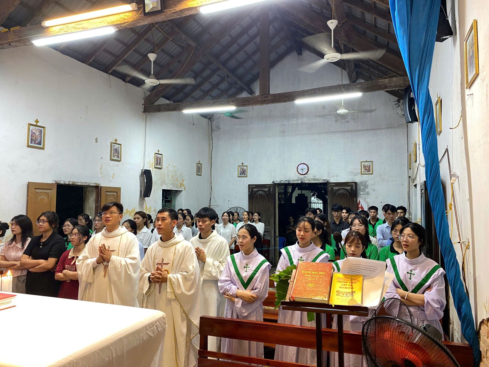 Thánh lễ cử hành lúc 19g30, do cha Đặc trách Gio-an Nguyễn Văn Cương chủ tế. Hiệp thông trong Thánh lễ có cha Đồng hành An-tôn Ngô Mạnh Lâm, SDB, hơn 40 bạn sinh viên và tân sinh viên trong nhóm cùng cộng đoàn giáo dân Giáo họ Phúc Khánh, tạo nên một bầu khí ấm áp, đầy tình huynh đệ.