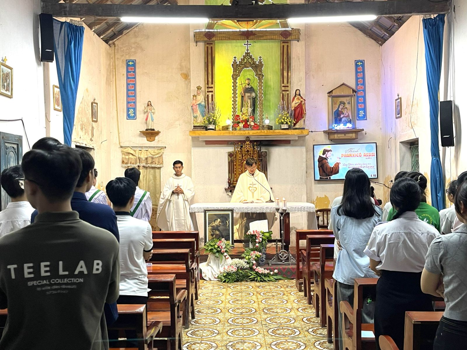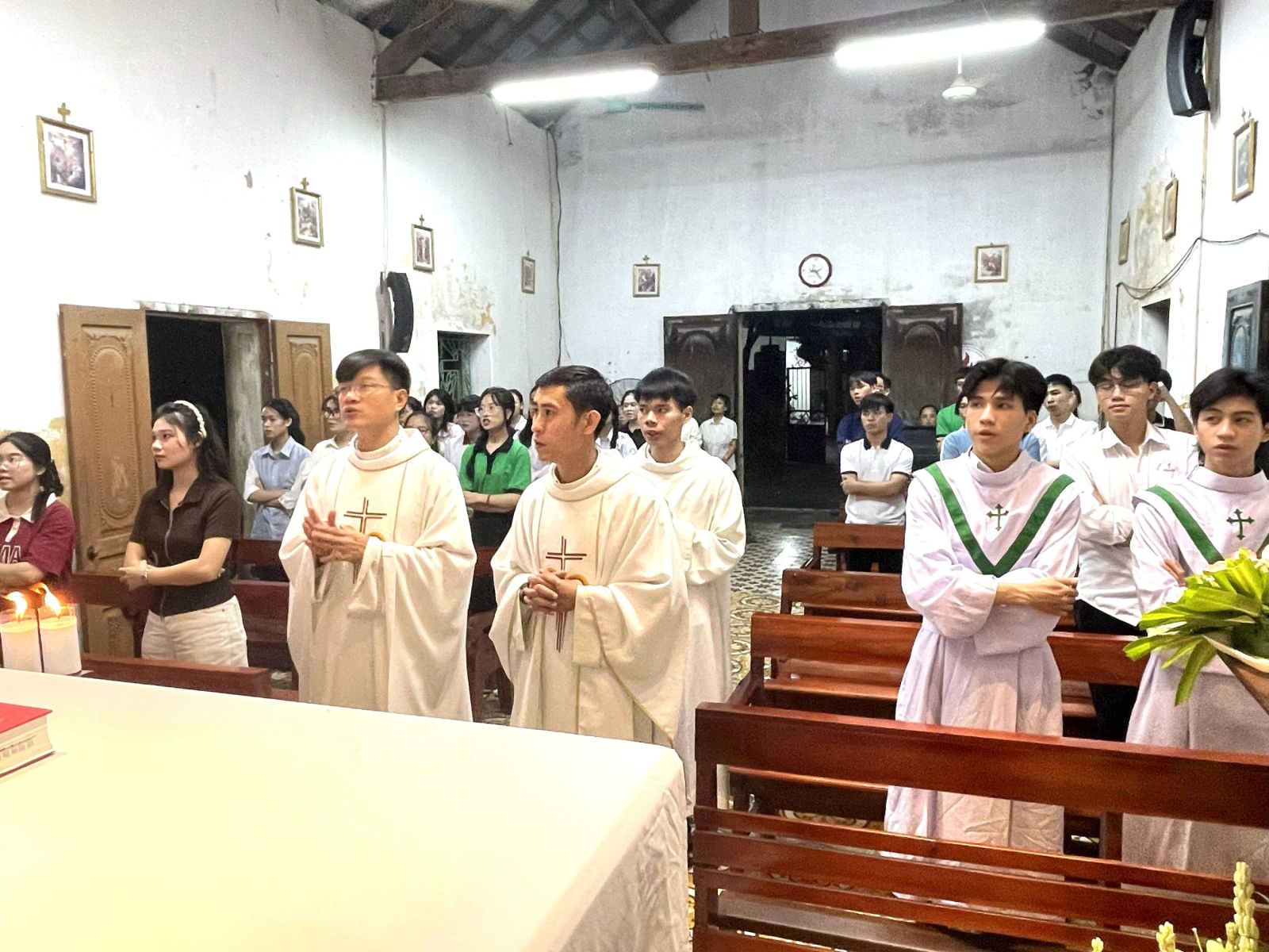 Thánh lễ được cử hành lúc 19g30, do cha Đặc trách Gio-an Nguyễn Văn Cương chủ tế, cùng đồng tế có cha Đồng hành An-tôn Ngô Mạnh Lâm, SDB, với sự tham dự của đông đảo các bạn sinh viên trong nhóm và cộng đoàn giáo dân Giáo họ Phúc Khánh.