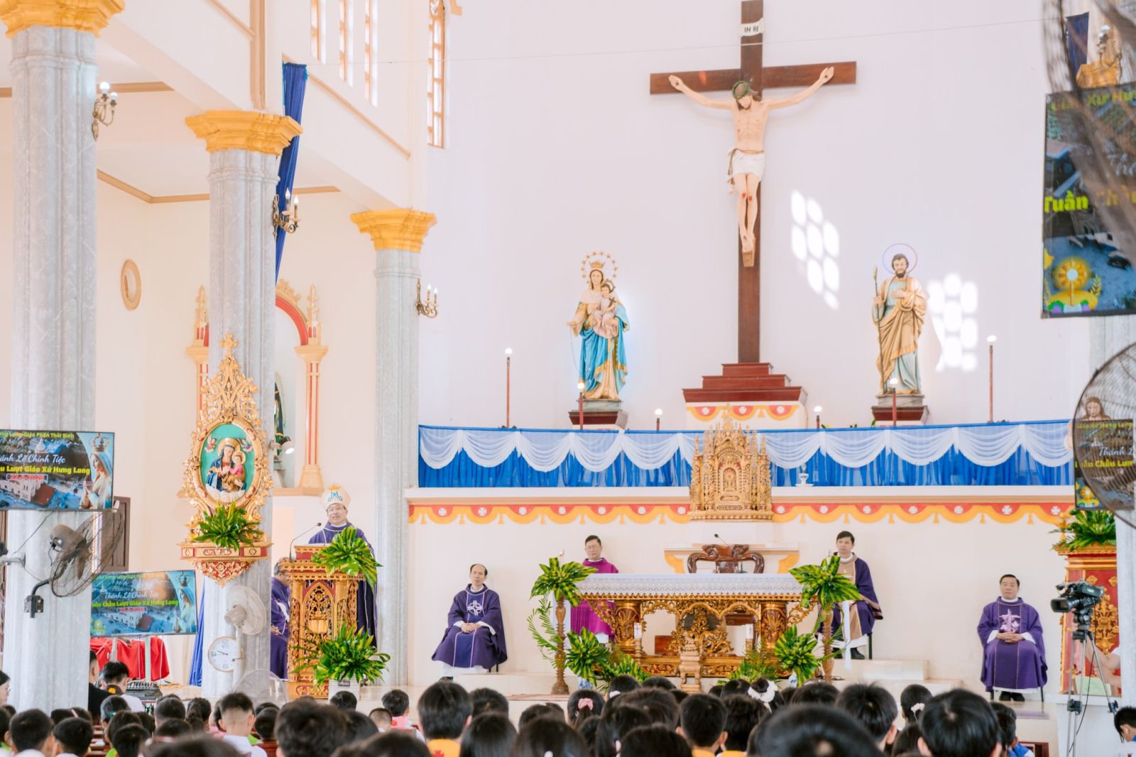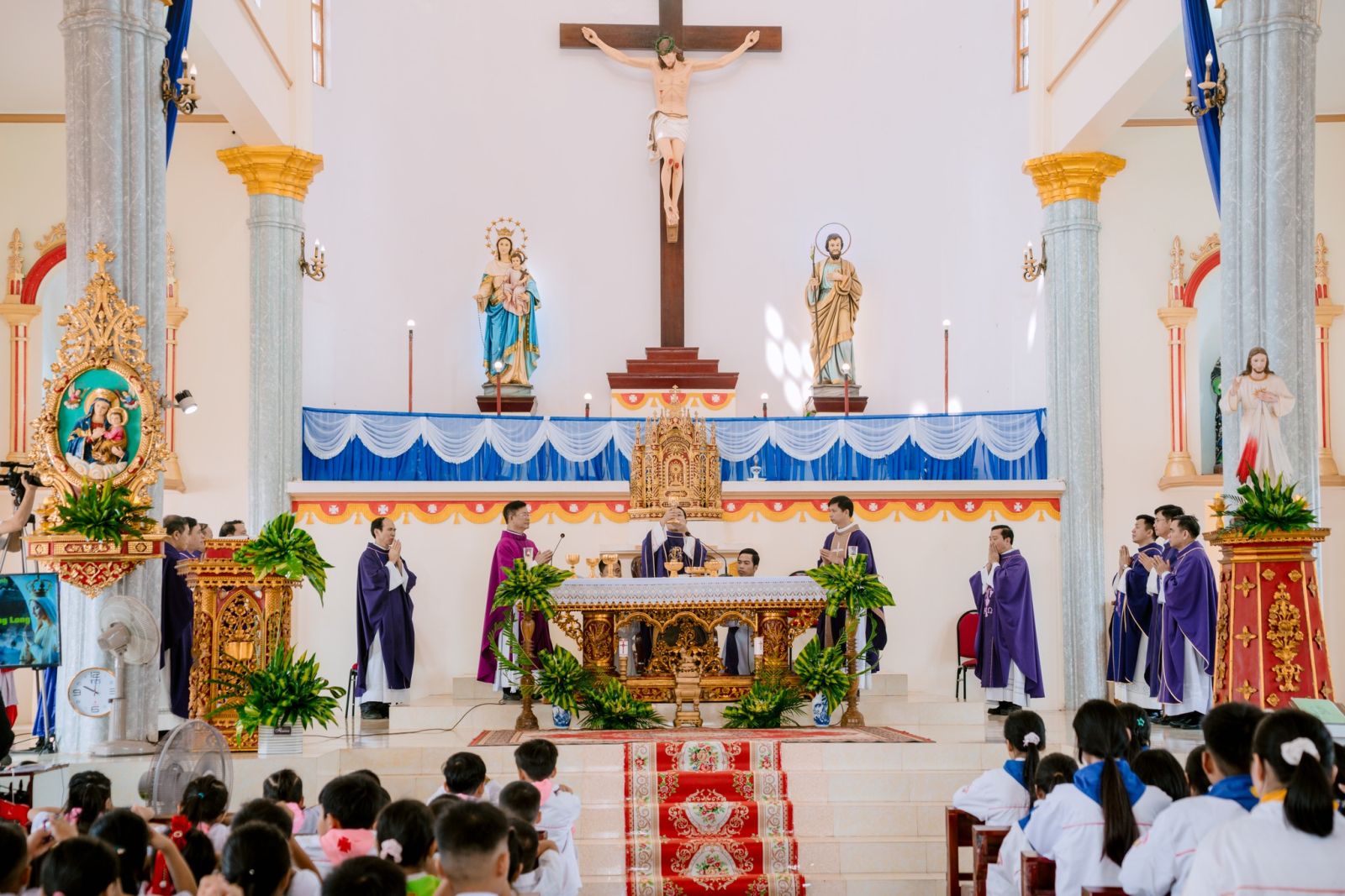 Sau cuộc rước long trọng đoàn đồng tế từ nhà Mục vụ tiến ra Thánh đường, Thánh lễ Chúa Nhật V Mùa Chay được cử hành với sự chủ tế của Đức cha Đa Minh.
