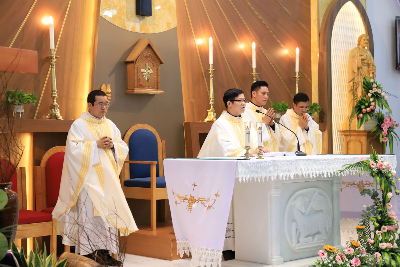 Cao điểm của ngày mừng lễ là Thánh lễ được cử hành lúc 17g30, do cha Phêrô Vêrôna Phạm Văn Nhật - Giám đốc Trụ sở - chủ tế. Mở đầu Thánh lễ, cha chủ tế có lời chào mừng và tri ân đến toàn thể cộng đoàn hiện diện. Ngài đặc biệt chúc mừng những ai nhận Thánh Giuse làm bổn mạng, đồng thời mời gọi mọi người hiệp ý tạ ơn Chúa vì hồng ân đức tin, và cùng nhau học nơi Thánh Giuse tinh thần khiêm nhường, vâng phục và tín thác.