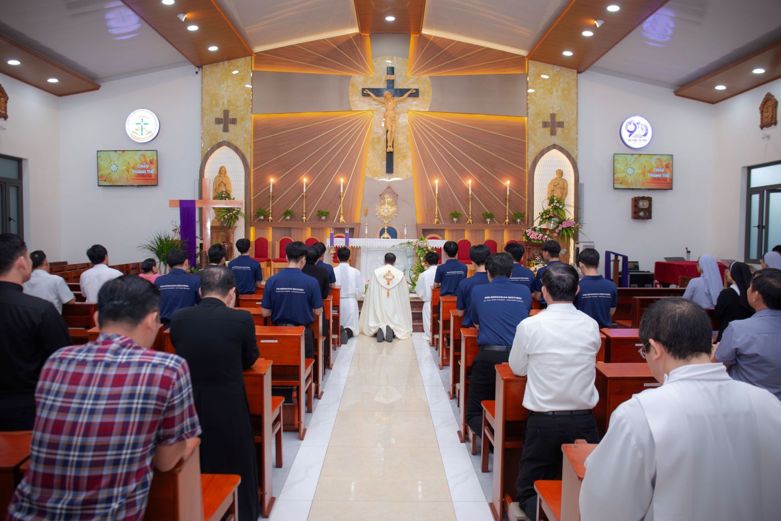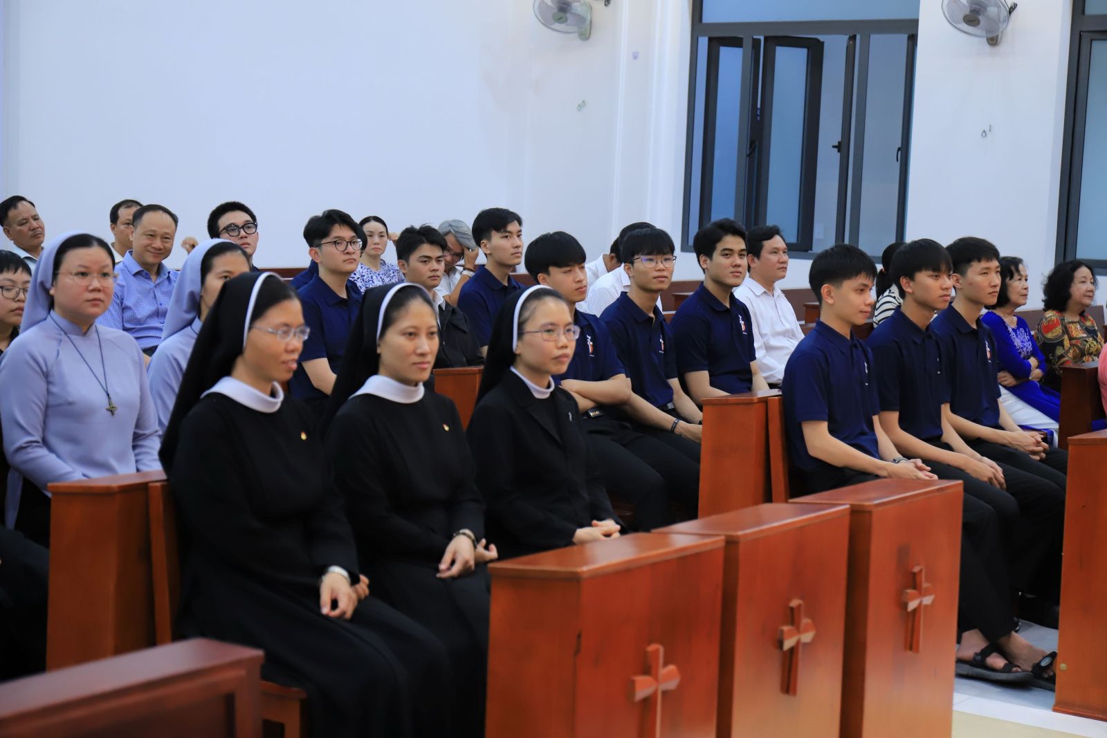 Đúng 17g00, cộng đoàn bước vào giờ Chầu Thánh Thể trong bầu khí linh thiêng. Trước Thánh Thể Chúa, mọi người được mời gọi lắng đọng tâm hồn, dâng lên Chúa những tâm tình tạ ơn vì muôn hồng ân đã lãnh nhận, đồng thời phó thác những thao thức, những dự định và hành trình ơn gọi của mình trong sự bảo trợ đầy yêu thương của Thánh Giuse.