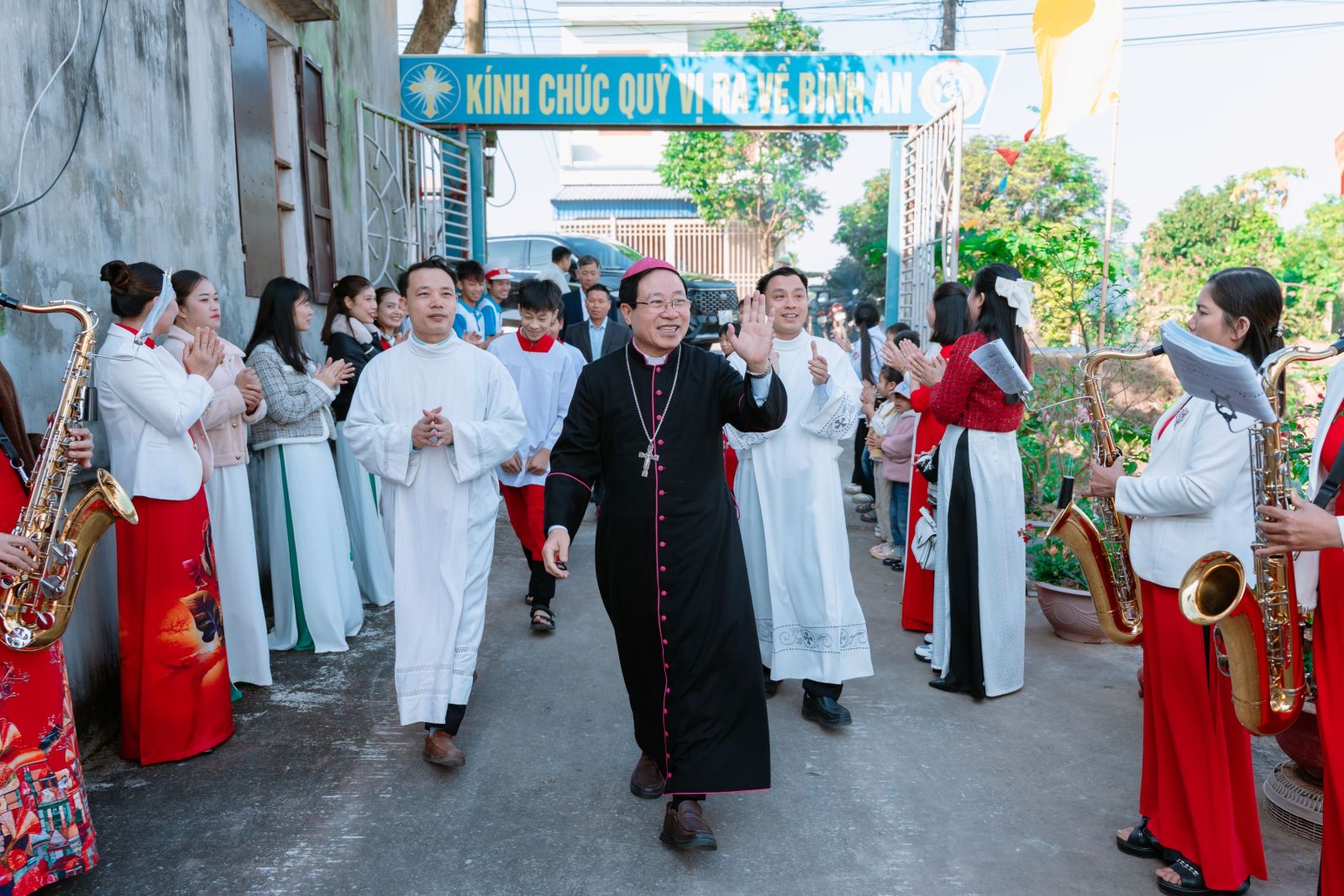 Sau đó, Đức cha, quý cha đồng tế và cộng đoàn rước Thánh Giá ra nhà thờ mới. Đức Cha chủ sự nghi thức cắt băng, mở đầu cho phần làm phép và thánh hóa ngôi nhà thờ. Trong giây phút long trọng này, cộng đoàn hiệp ý tạ ơn Chúa vì biết bao hồng ân Người đã thương tuôn đổ, giúp công trình được hoàn thành tốt đẹp. Đây là sự kiện đánh dấu hành trình xây dựng dài lâu với nhiều cố gắng và đóng góp của mọi thành phần dân Chúa đối với công trình trọng đại - nơi cộng đoàn sẽ quy tụ cử hành các bí tích và nuôi dưỡng đời sống thiêng liêng.
