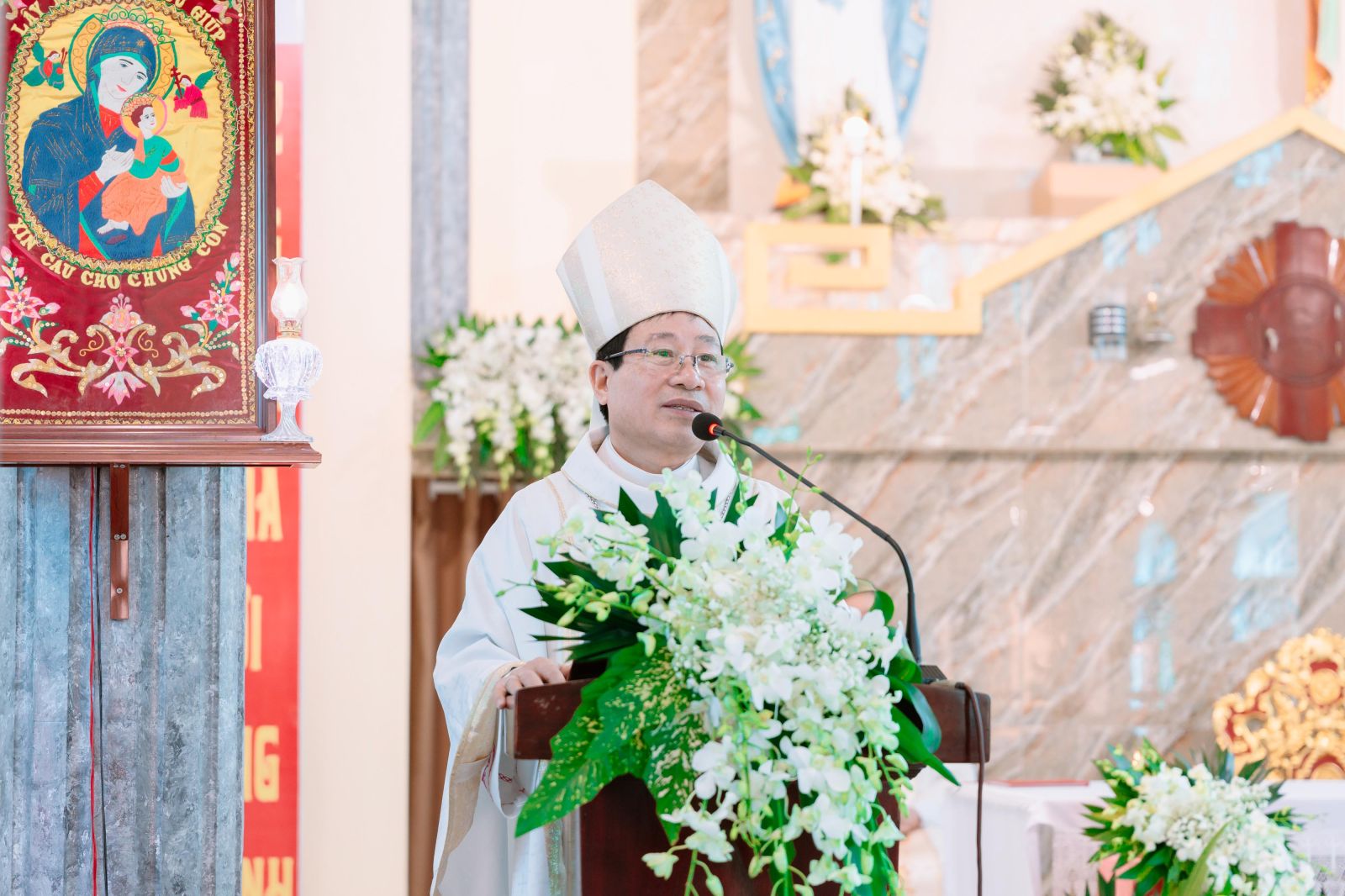 Trong phần bài giảng, Đức cha Đa-minh nhấn mạnh ý nghĩa của ngày lễ trọng, đồng thời mời gọi mỗi người giáo dân biết noi gương Đức Maria trong đời sống đức tin, thực hành sự vâng phục, khiêm nhường và tín thác. Đức cha cũng nhắn nhủ mỗi người trong cộng đoàn cần có trách nhiệm gìn giữ, bảo tồn và quý trọng nhà thờ như một hồng ân quý giá, nhằm xây dựng đời sống đạo ngày một vững mạnh hơn; đồng thời tích cực xây dựng ngôi đền thờ thiêng liêng trong tâm hồn của mỗi người.