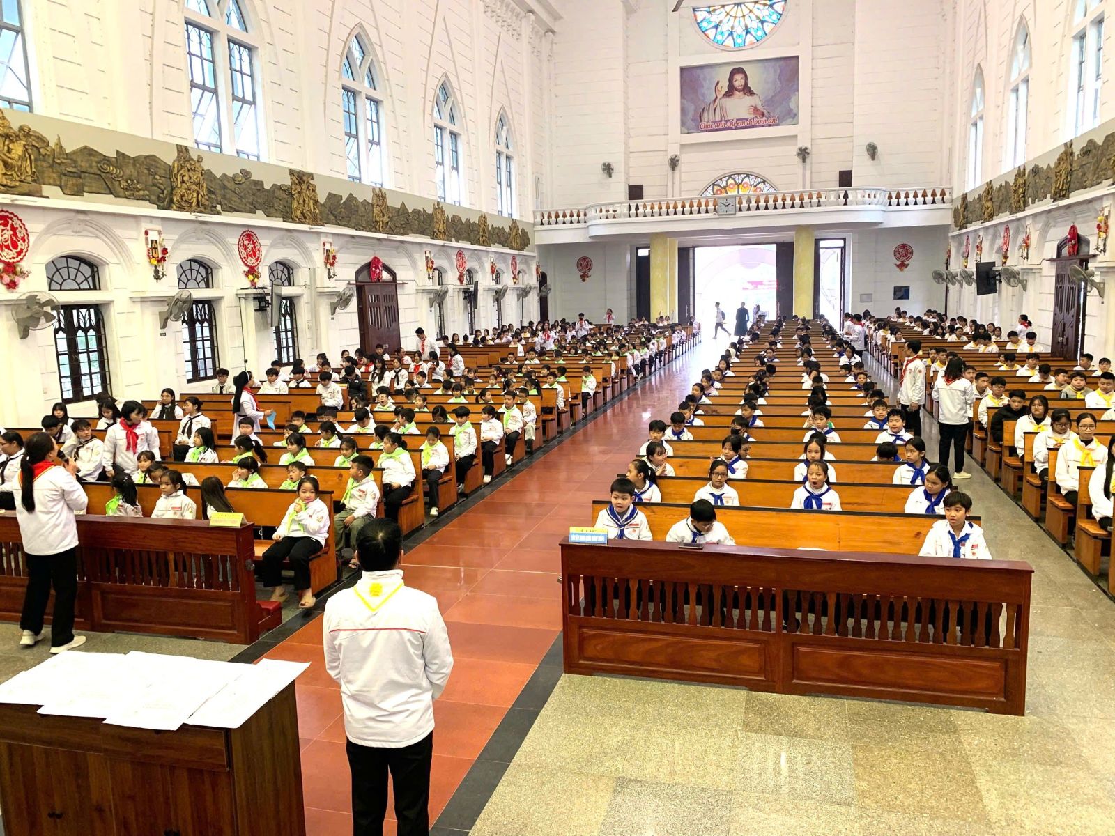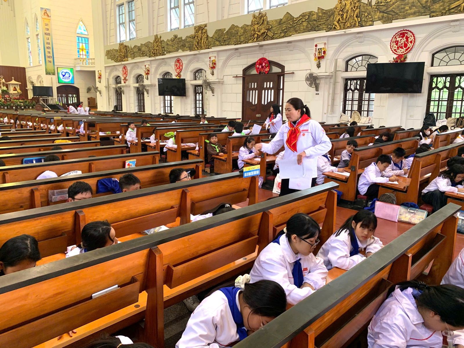 Lúc 13g30, các em Thiếu nhi đã tập trung đông đủ và ổn định trong Nhà Thờ. Ban Giáo lý đã quy định chỗ ngồi cụ thể cho từng lớp, đảm bảo sự trật tự và nghiêm trang trong giờ thi. Đồng hành với các em Thiếu nhi trong buổi thi, có quý thầy Phó tế, quý dì Tu xá Đaminh và các giáo lý viên.