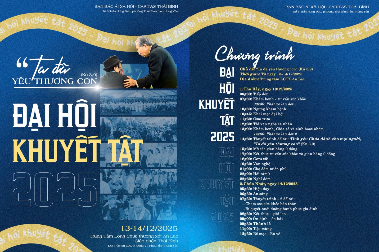 Chương trình "ĐẠI HỘI KHUYẾT TẬT" tại Giáo phận Thái Bình sẽ diễn ra vào Thứ Bảy và Chúa Nhật (ngày 13-14/12/2025) với số lượng khoảng 4500 tham dự viên. Địa điểm: Trung Tâm Lòng Chúa thương xót An Lạc, Thái Bình (địa chỉ: thôn An Lạc, phường Vũ Phúc, tỉnh Hưng Yên)