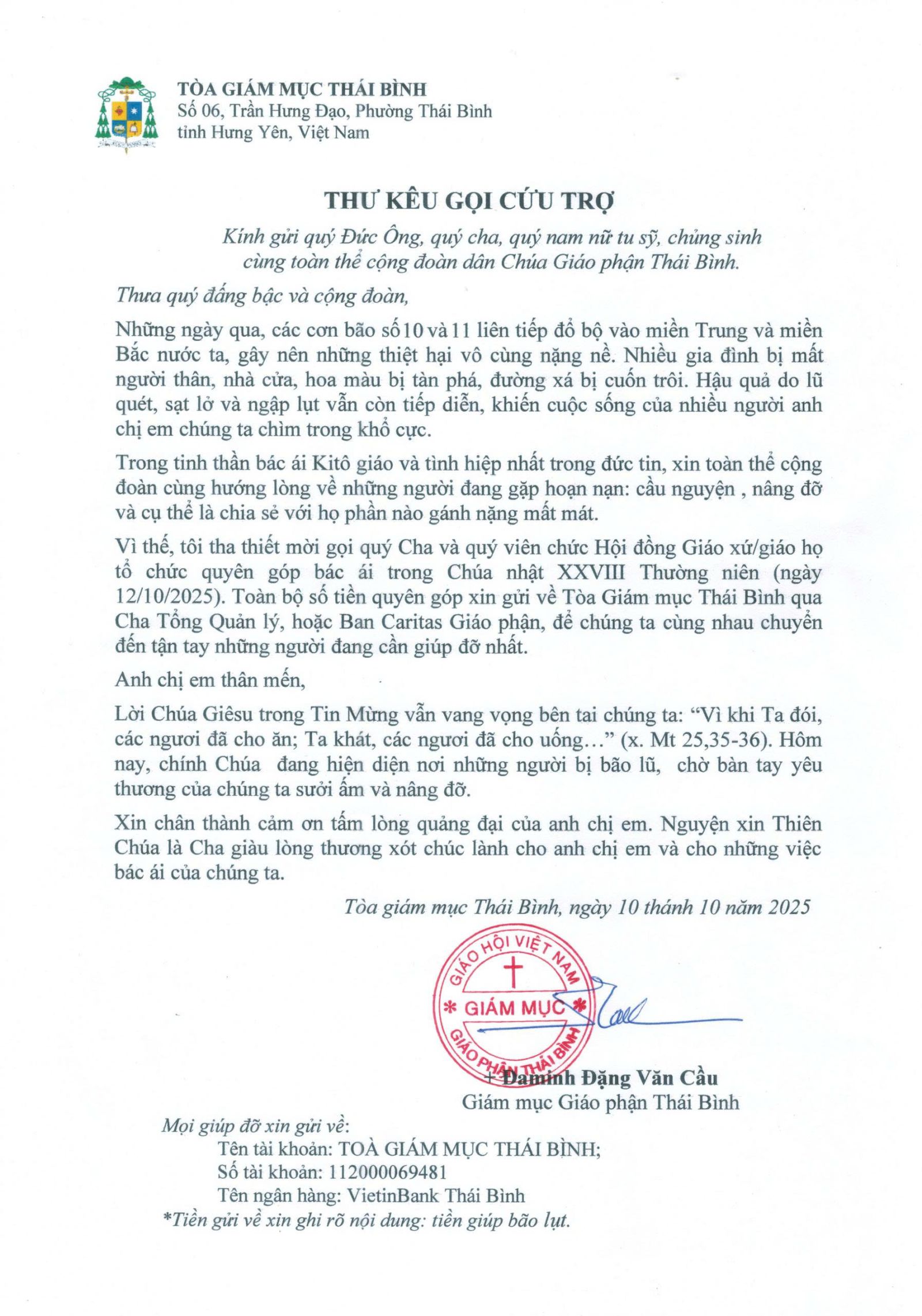 Vì thế, tôi tha thiết mời gọi quý Cha và quý viên chức Hội đồng Giáo xứ/giáo họ tổ chức quyên góp bác ái trong Chúa nhật XXVIII Thường niên (ngày 12/10/2025). Toàn bộ số tiền quyên góp xin gửi về Tòa Giám mục Thái Bình qua Cha Tổng Quản lý, hoặc Ban Caritas Giáo phận, để chúng ta cùng nhau chuyển đến tận tay những người đang cần giúp đỡ nhất.