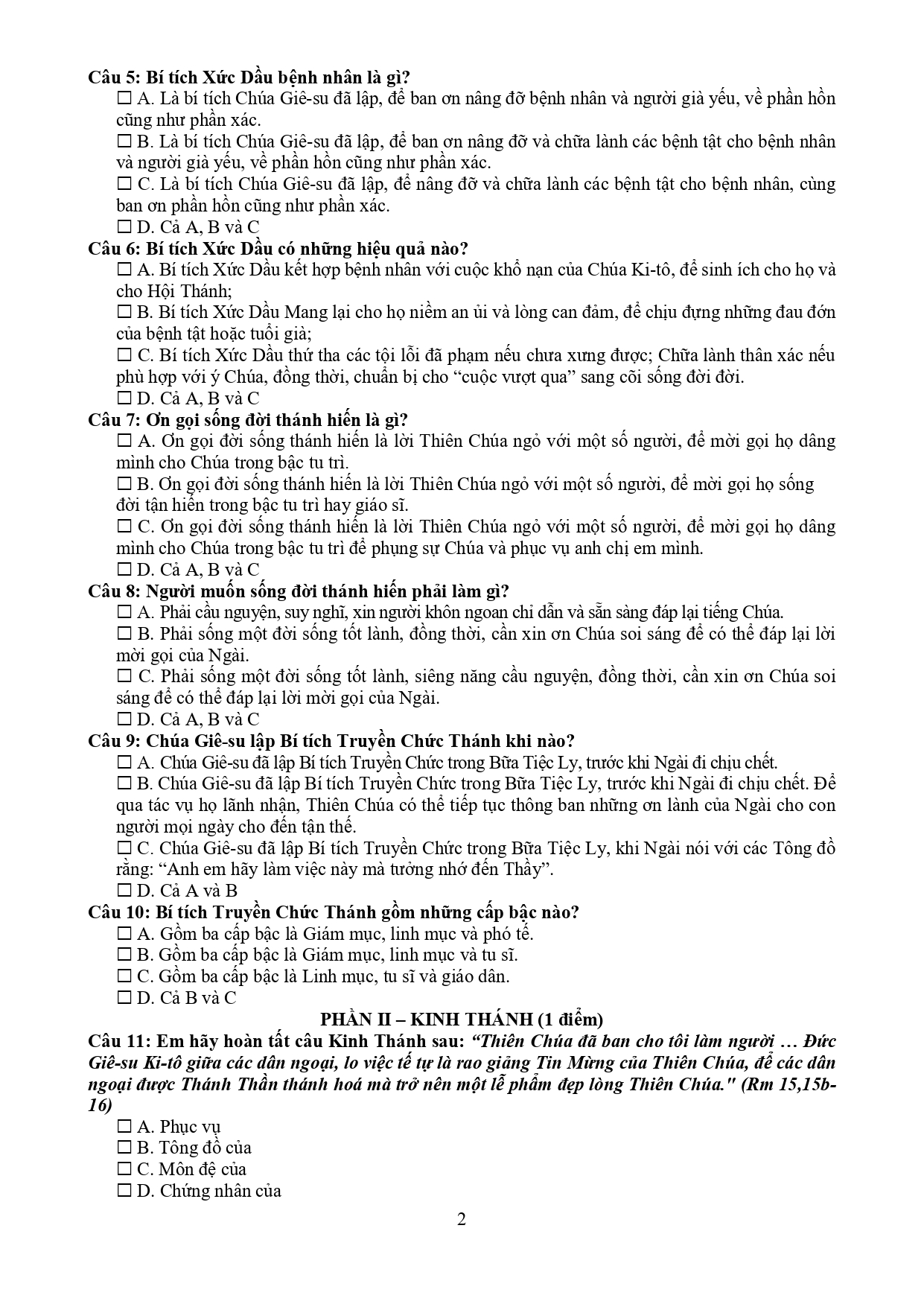 Ban Giáo lý Đức Tin GPTB: Hân hạnh giới thiệu ĐỀ THI HỌC KỲ 1 - Dành cho lớp Huấn luyện GLV Cấp 2 (Đề số 2)