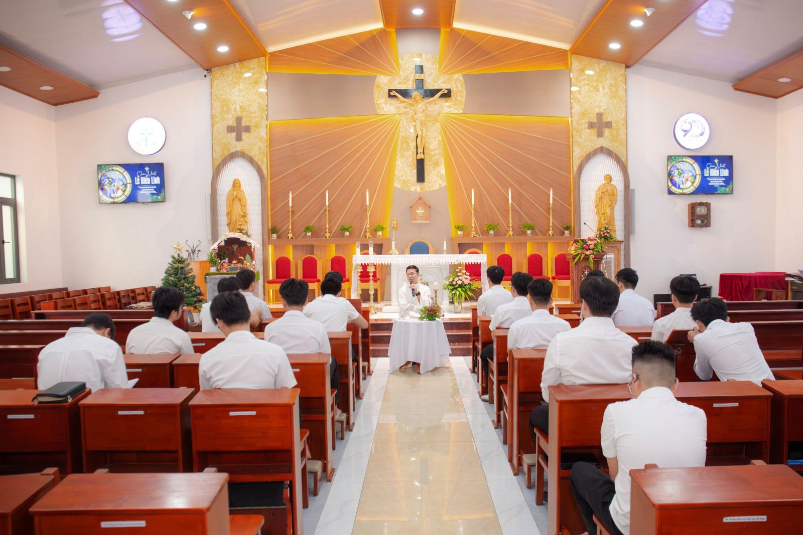 Đỉnh cao của ngày tĩnh tâm là Thánh lễ Chúa Hiển Linh. Trong bài giảng, cha Đồng hành Giuse Trần Ngọc Tuấn đã chia sẻ với anh em chủ đề: “Để Chúa soi dẫn và trở thành ánh sáng cho mọi người.” Dưới ánh sáng Lời Chúa của ba bài đọc, cha giúp anh em nhận ra rằng ánh sáng thật đã đi vào lịch sử nhân loại, đó chính là Đức Giêsu Kitô. Ánh sáng ấy đòi hỏi con người phải khát khao tìm kiếm, dám lên đường và sẵn sàng để được biến đổi. Cha cũng mời gọi anh em nhìn lại ý nghĩa của việc tĩnh tâm: đó là ngồi lại bên Chúa như Đức Maria năm xưa, mở lòng đón nhận Người, để từ đó trở nên ánh sáng cho người khác. Như các Nhà Đạo Sĩ sau khi gặp Chúa đã trở về bằng con đường khác, cuộc gặp gỡ đích thực với Thiên Chúa luôn dẫn đến một sự thay đổi thật sự trong đời sống.