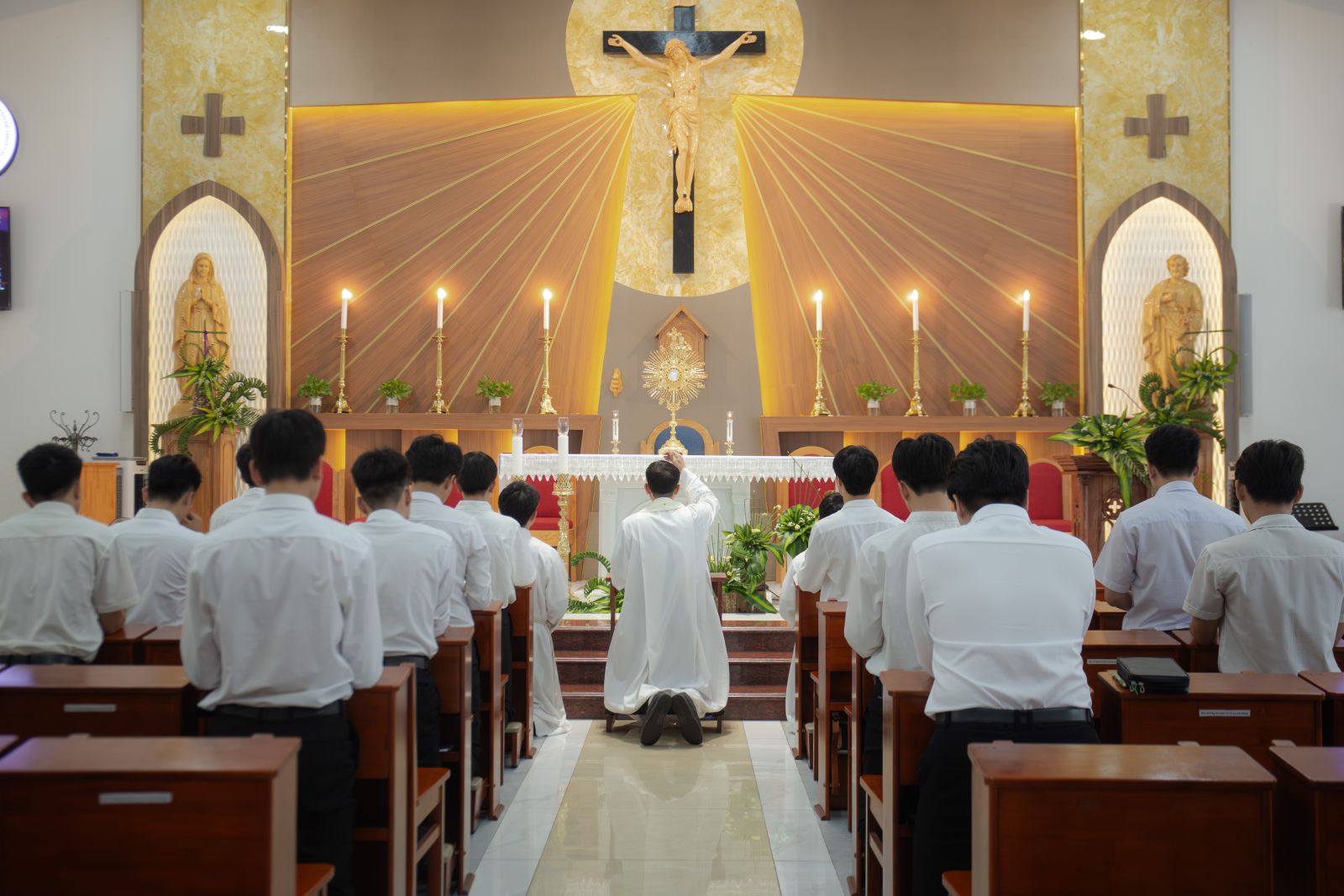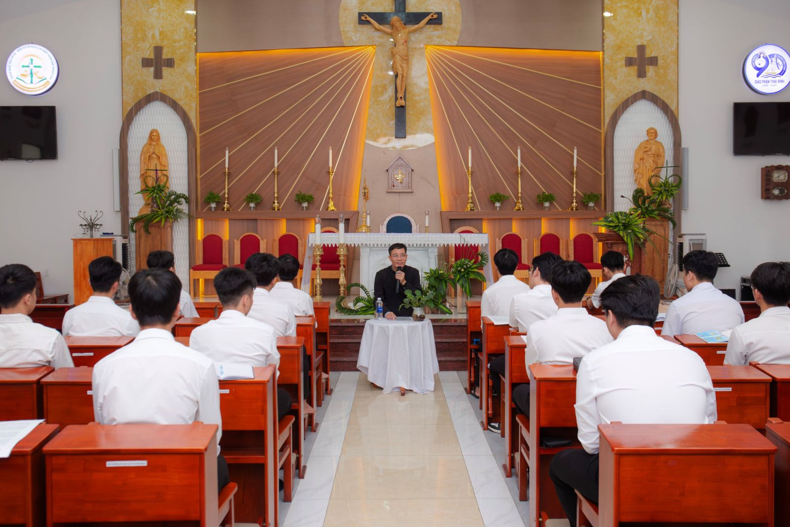 Sau giờ chia sẻ, anh em bước vào giờ Chầu Thánh Thể, dành thời gian thinh lặng cầu nguyện trước Chúa, hiệp thông với toàn Giáo phận trong tâm tình hướng tới kỷ niệm 90 năm thành lập Giáo phận Thái Bình. Trong bầu khí linh thiêng ấy, anh em cũng lãnh nhận Bí tích Hòa Giải, trở về giao hòa với Chúa để chuẩn bị tâm hồn cách xứng đáng tham dự Thánh lễ.