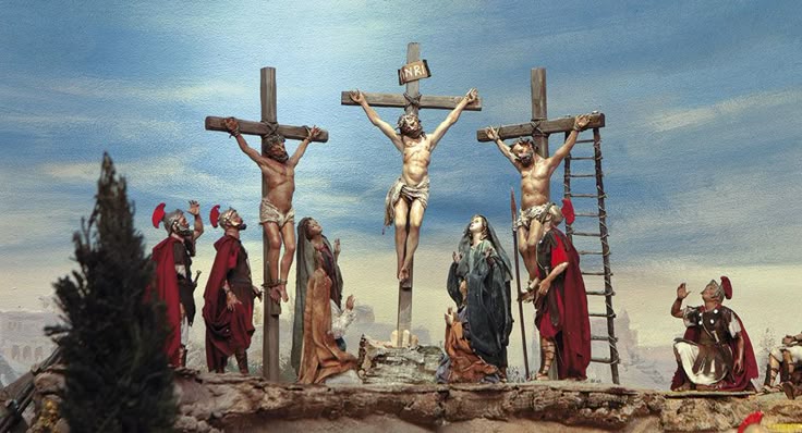 Như thế, chúng ta có trước mắt một khung cảnh là Đồi Sọ, tại đó Chúa Giê-su chẳng có tội tình gì, lại bị đóng đinh giữa hai tên gian phi, hai tội nhân bị kết án tử.