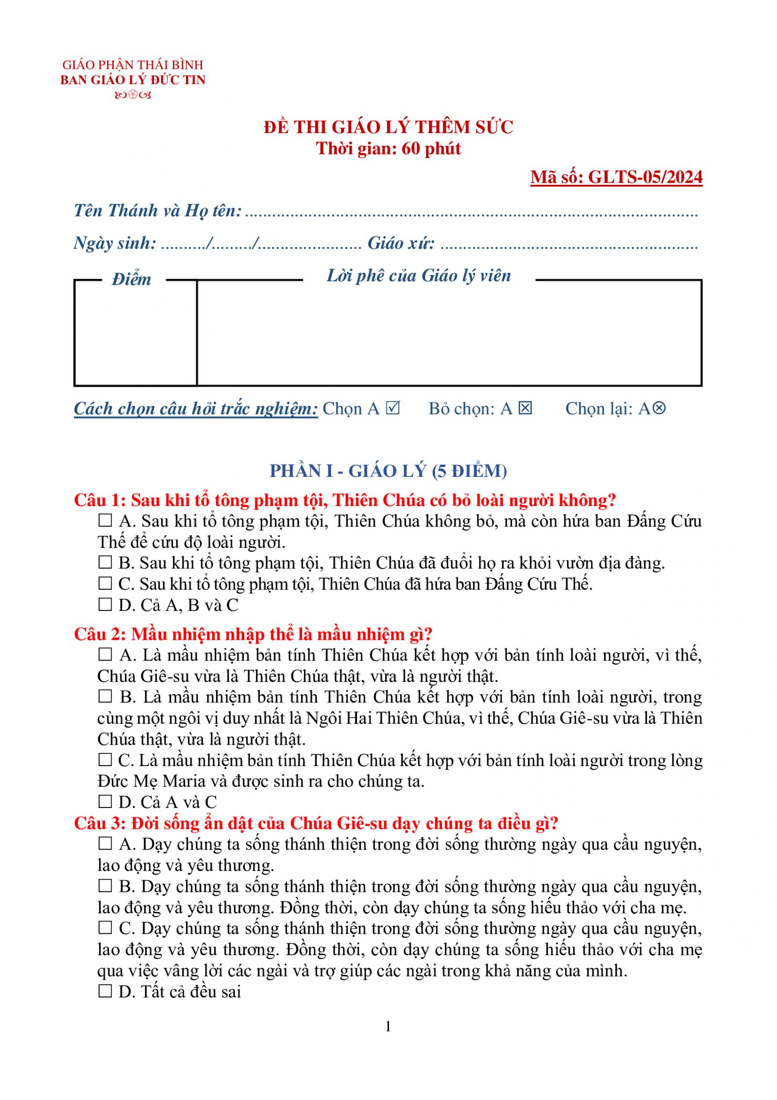 ĐỀ THI GIÁO LÝ THÊM SỨC. Mã số GLTS-01/2024