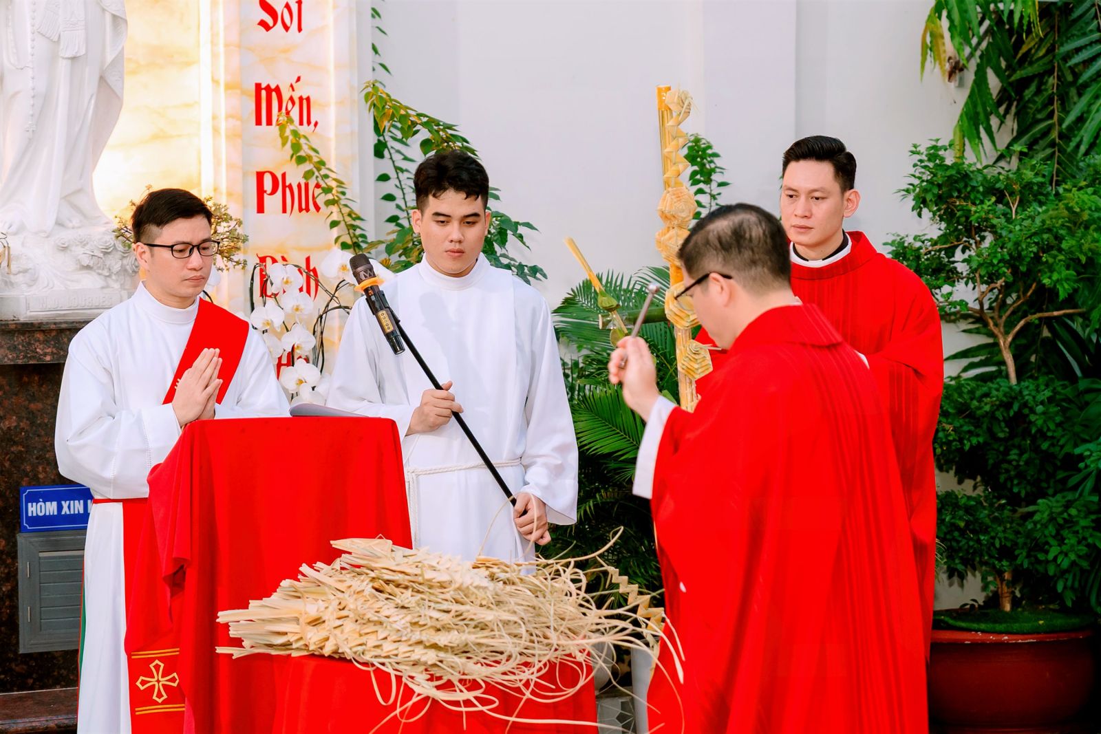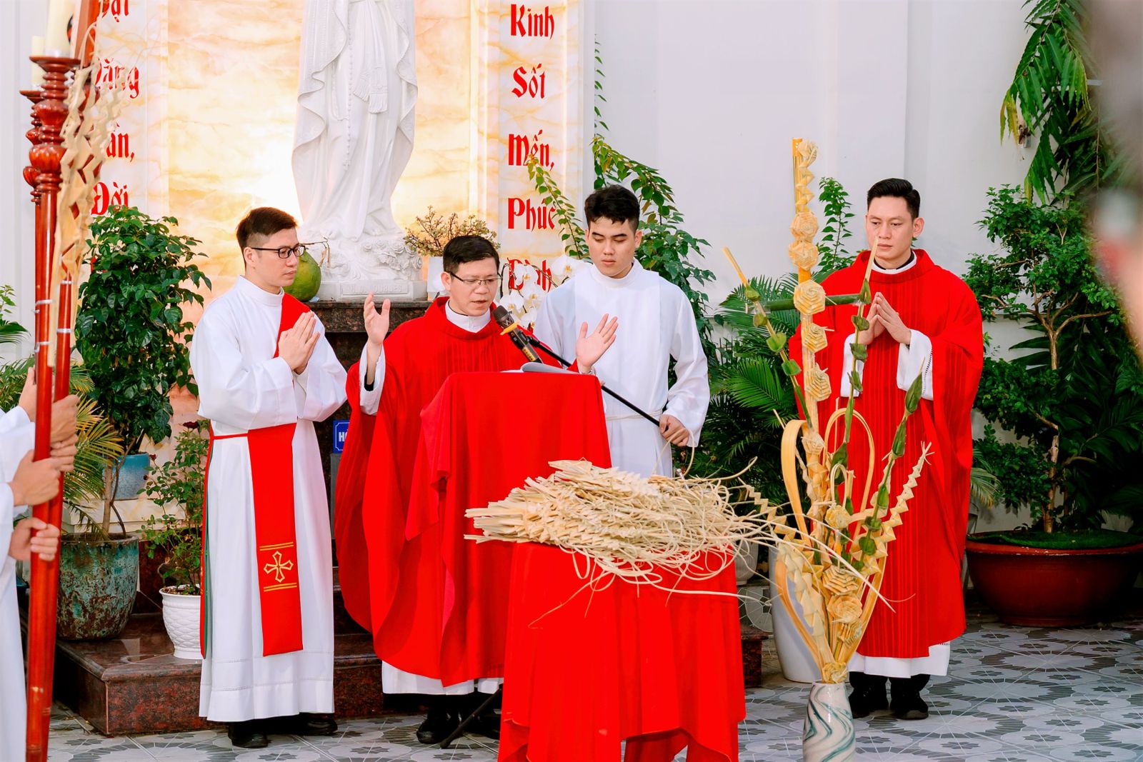 Sau cuộc rước, Thánh lễ Chúa nhật Lễ Lá được cử hành do Cha Giám đốc Trụ sở Giáo phận Thái Bình – miền Nam, cha Phêrô Verona Phạm Văn Nhật, chủ tế; cùng đồng tế có quý cha đang tu học tại Trụ sở và thầy phó tế. Mở đầu Thánh lễ, cha chủ tế mời gọi cộng đoàn không chỉ tưởng niệm một biến cố lịch sử, nhưng biết sống mầu nhiệm Lễ Lá trong hiện tại: đón nhận Đức Kitô vào tâm hồn và trung thành bước theo Người trên hành trình Vượt Qua – hành trình đi qua đau khổ để tiến tới vinh quang Phục Sinh.