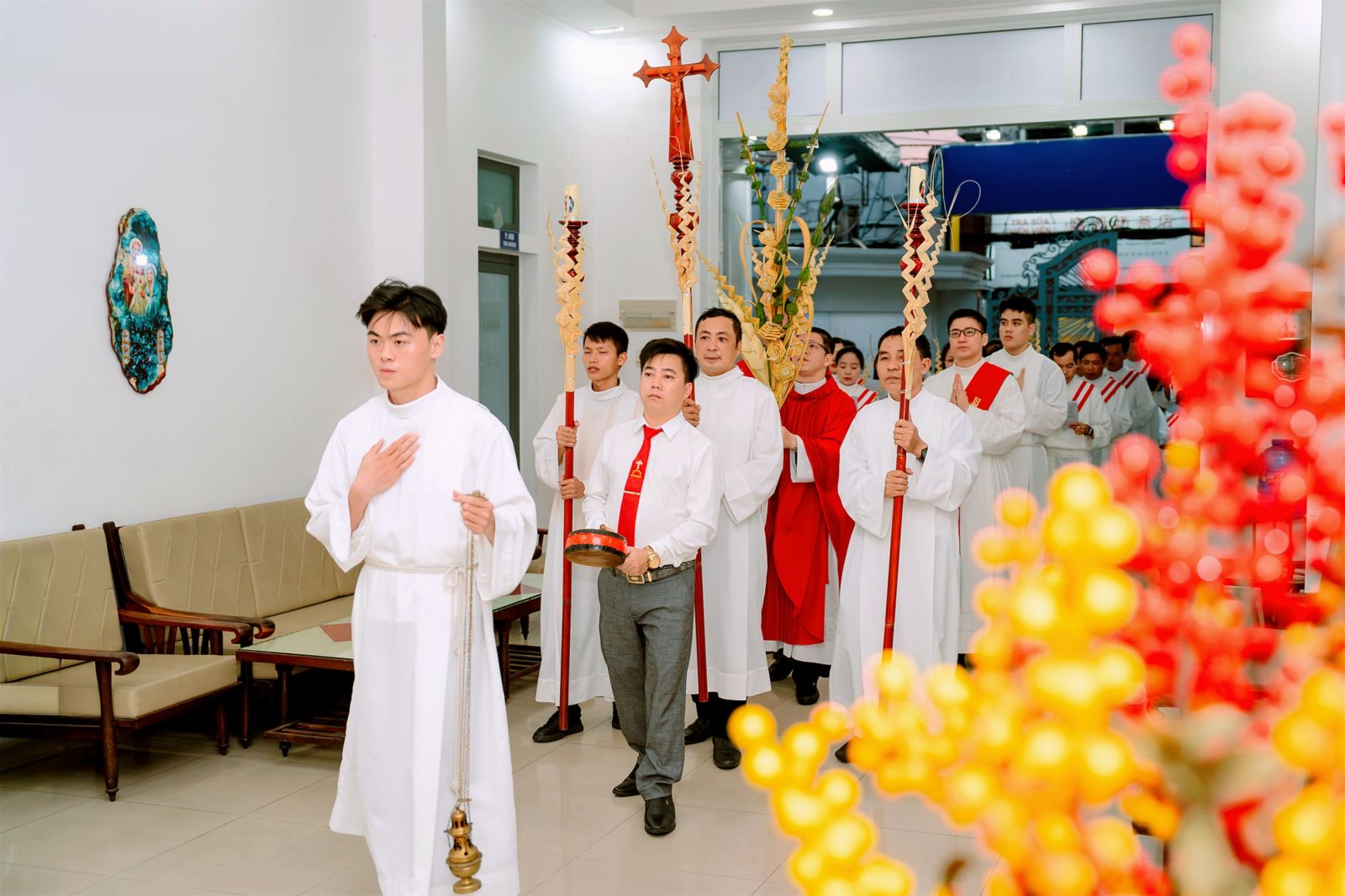 Vào lúc 18g00, cộng đoàn long trọng cử hành nghi thức làm phép lá và rước lá, tái hiện hình ảnh dân thành xưa hân hoan đón Chúa vào Giêrusalem với cành lá trên tay và lời tung hô: “Hoan hô Con Vua Đavít!”. Đoàn rước tiến bước trong tâm tình sốt sắng, diễn tả ước nguyện đón rước Chúa vào chính cuộc đời mỗi người. Những cành lá được giơ cao cùng tiếng hát chúc tụng vang lên như lời tuyên xưng niềm tin vào Đức Kitô – Đấng đang tiến vào thành thánh và cũng tiến vào tâm hồn người tín hữu.