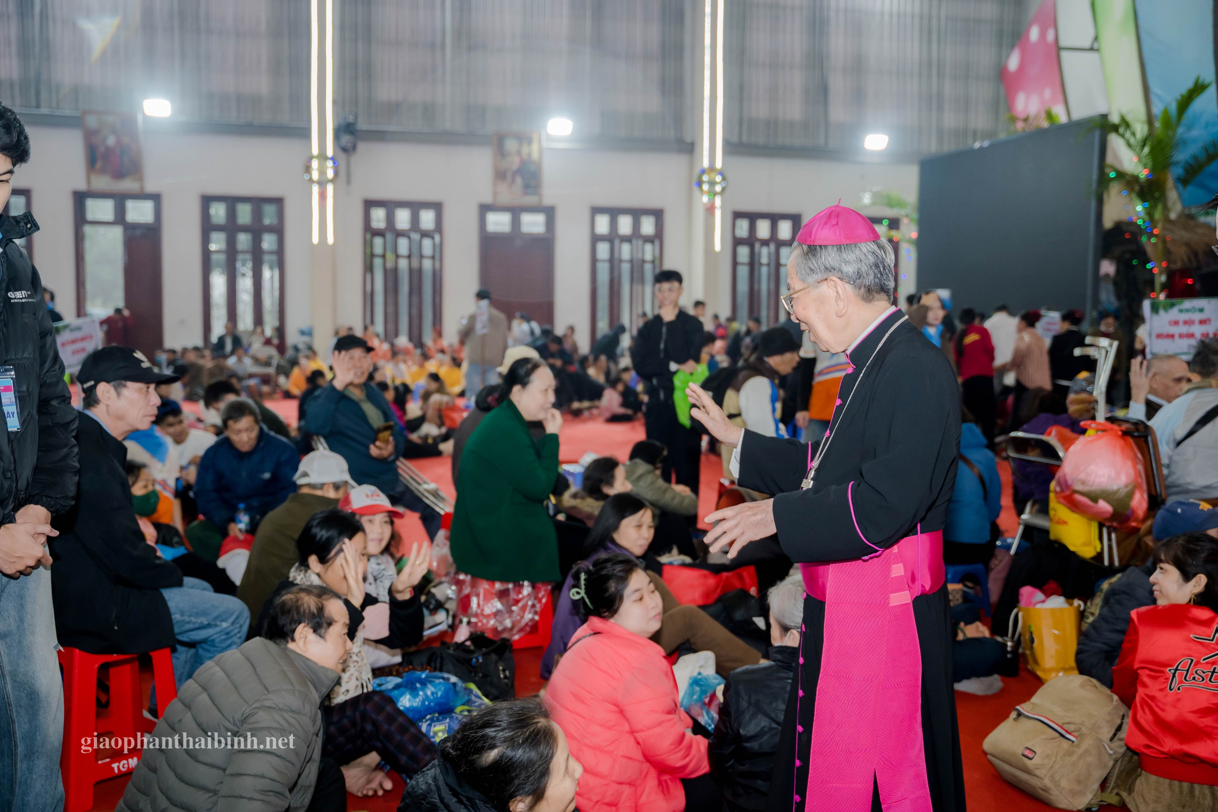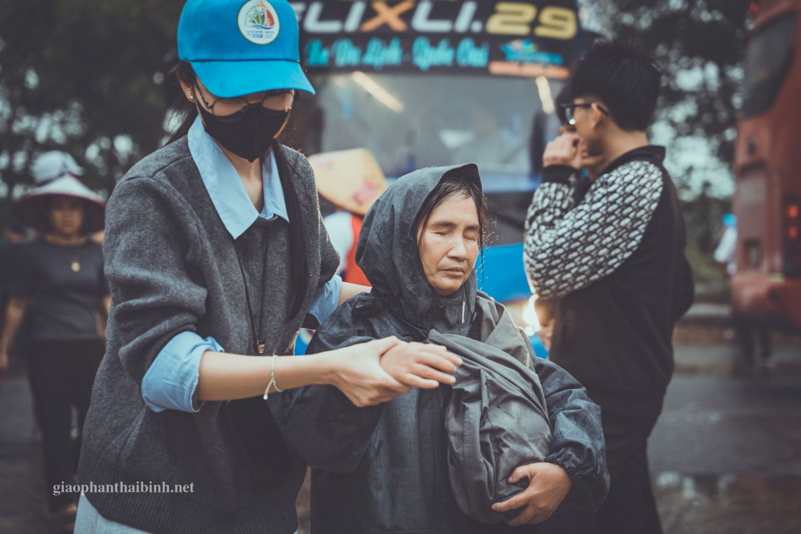 Giữa dòng người ướt mưa, hình ảnh Đức cha Phê-rô Nguyễn Văn Đệ khiến tôi lặng đi. Dù tuổi cao, sức khỏe hạn chế, ngài vẫn ra tận nơi đón các đoàn, cúi xuống xoa đầu các em nhỏ khuyết tật, ánh mắt hiền hậu và nụ cười ấm áp nổi bật giữa tiết trời giá lạnh. Tôi chợt hiểu: tình yêu không cần ồn ào, chỉ cần hiện diện đúng lúc.