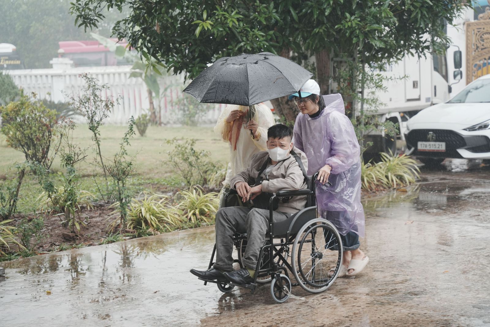 Giờ ăn trưa, mưa vẫn không dứt. Các ông bà trưởng, phó đoàn cùng các thầy, các dì đội mưa nhận từng suất cơm hộp. Áo ướt, tay lạnh run, nhưng không ai than phiền. Ở bậc cầu thang, họ nhịp nhàng khiêng xe lăn, đưa anh chị em vào chỗ khô ráo. Những việc âm thầm ấy lặp đi lặp lại, đều đặn và tự nhiên như hơi thở cuộc sống.