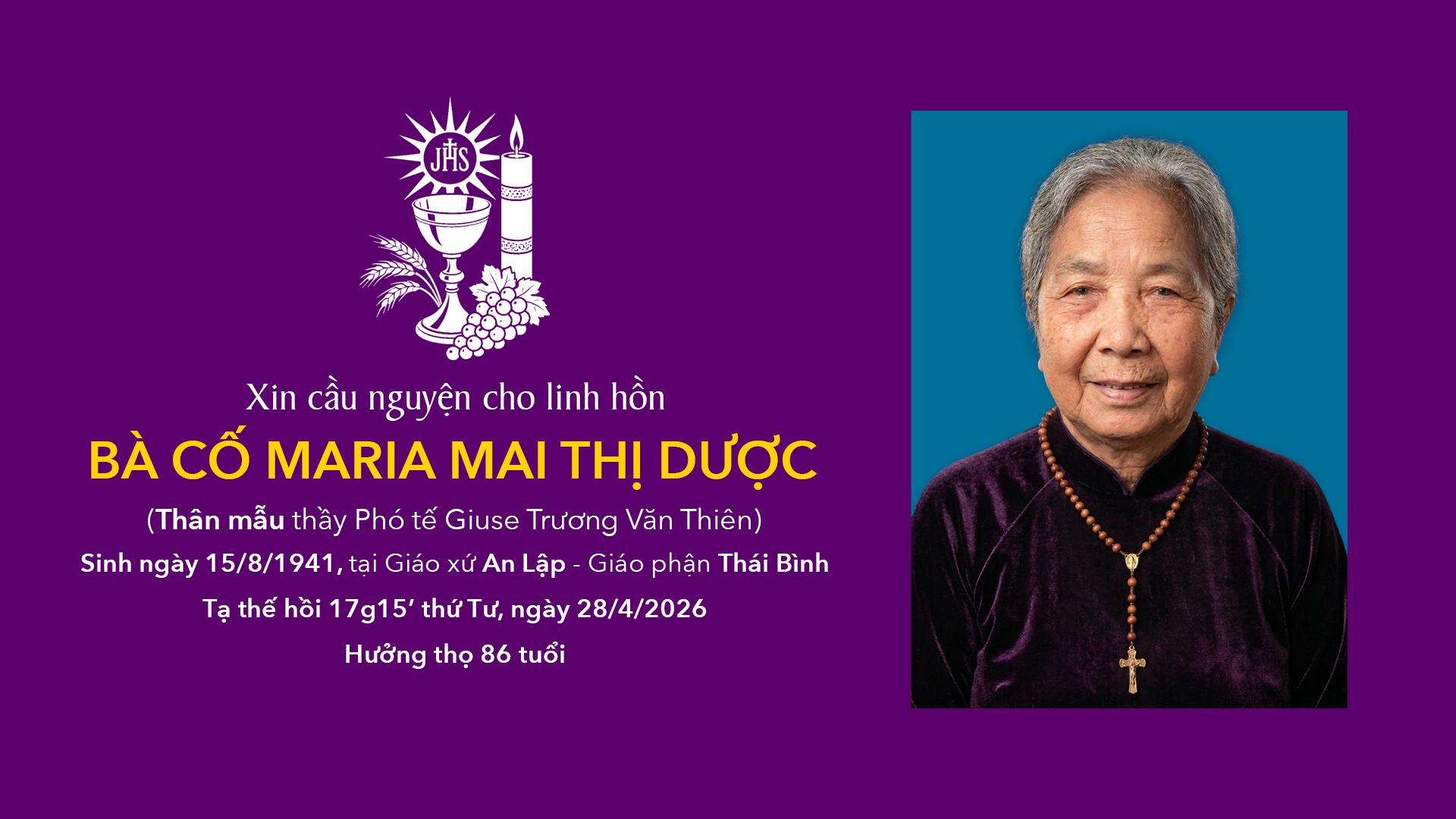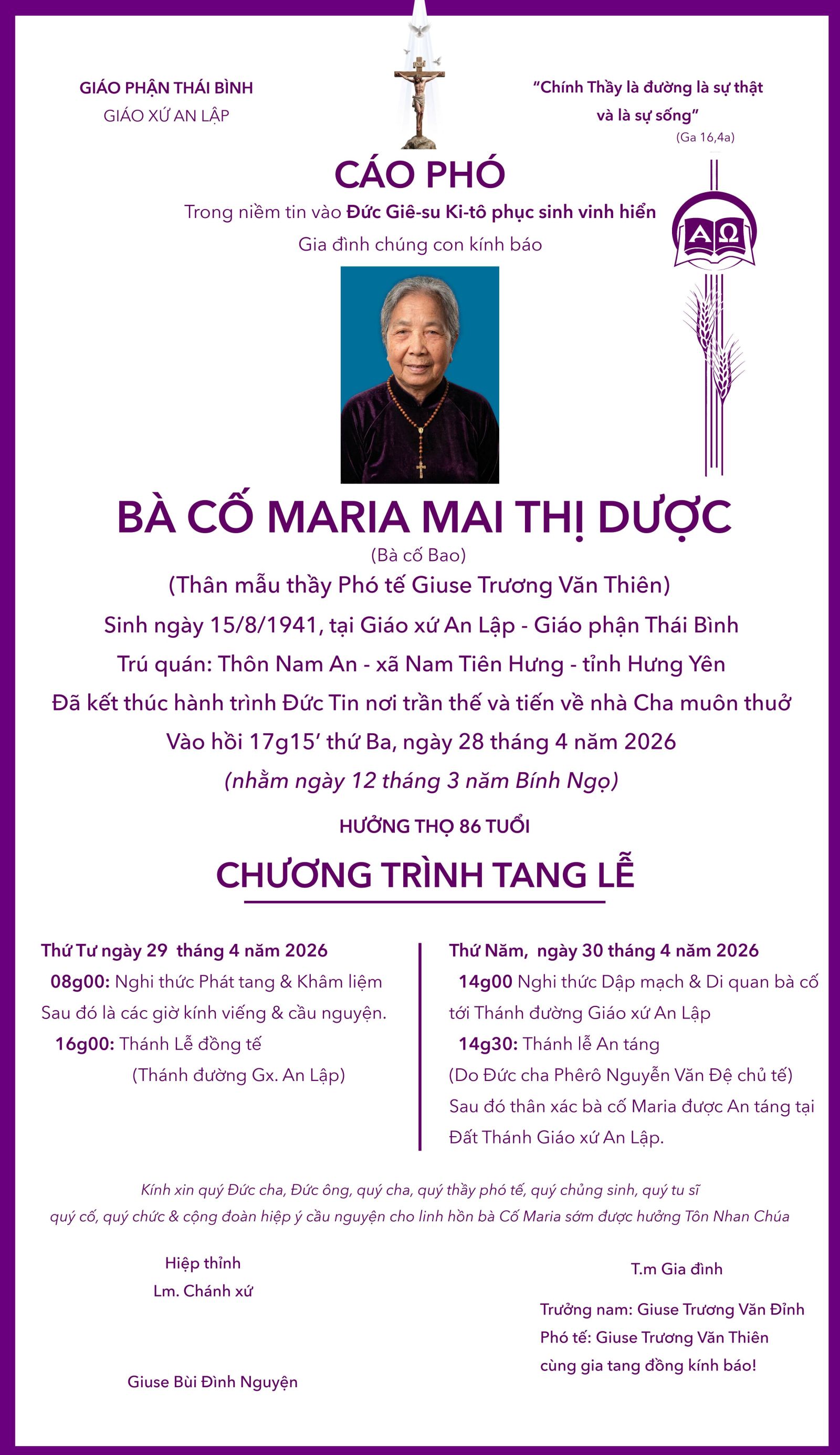Trong niềm tin vào Chúa Ki-tô Phục Sinh, gia đình chúng con xin kính báo: Bà Cố Maria Nguyễn Thị Gái – sinh năm 1962, thường trú tại thôn Thái Sa, xã Thư Vũ, tỉnh Hưng Yên; đã an nghỉ trong Chúa hồi 04g30 ...