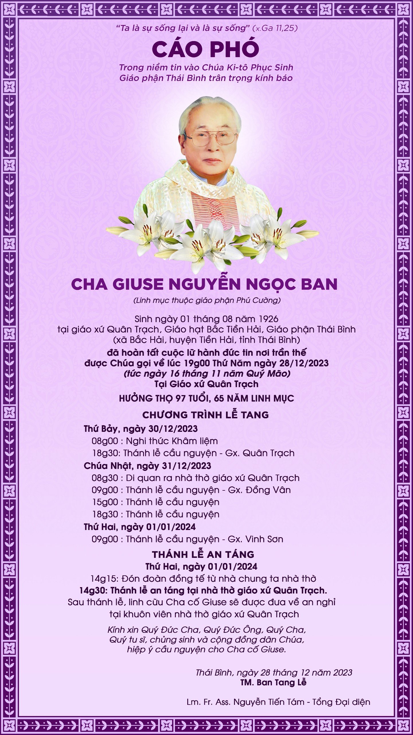 Ông cố Vinhsơn Đỗ Văn Phán (Thân phụ Nữ tu Maria Đỗ Thị Luyên, OP) sinh ngày 01.02.1952 tại Giáo họ Kính Danh, Giáo xứ Cổ Việt, Giáo phận Thái Bình, đã hoàn tất cuộc lữ hành đức tin nơi trần thế, được ...