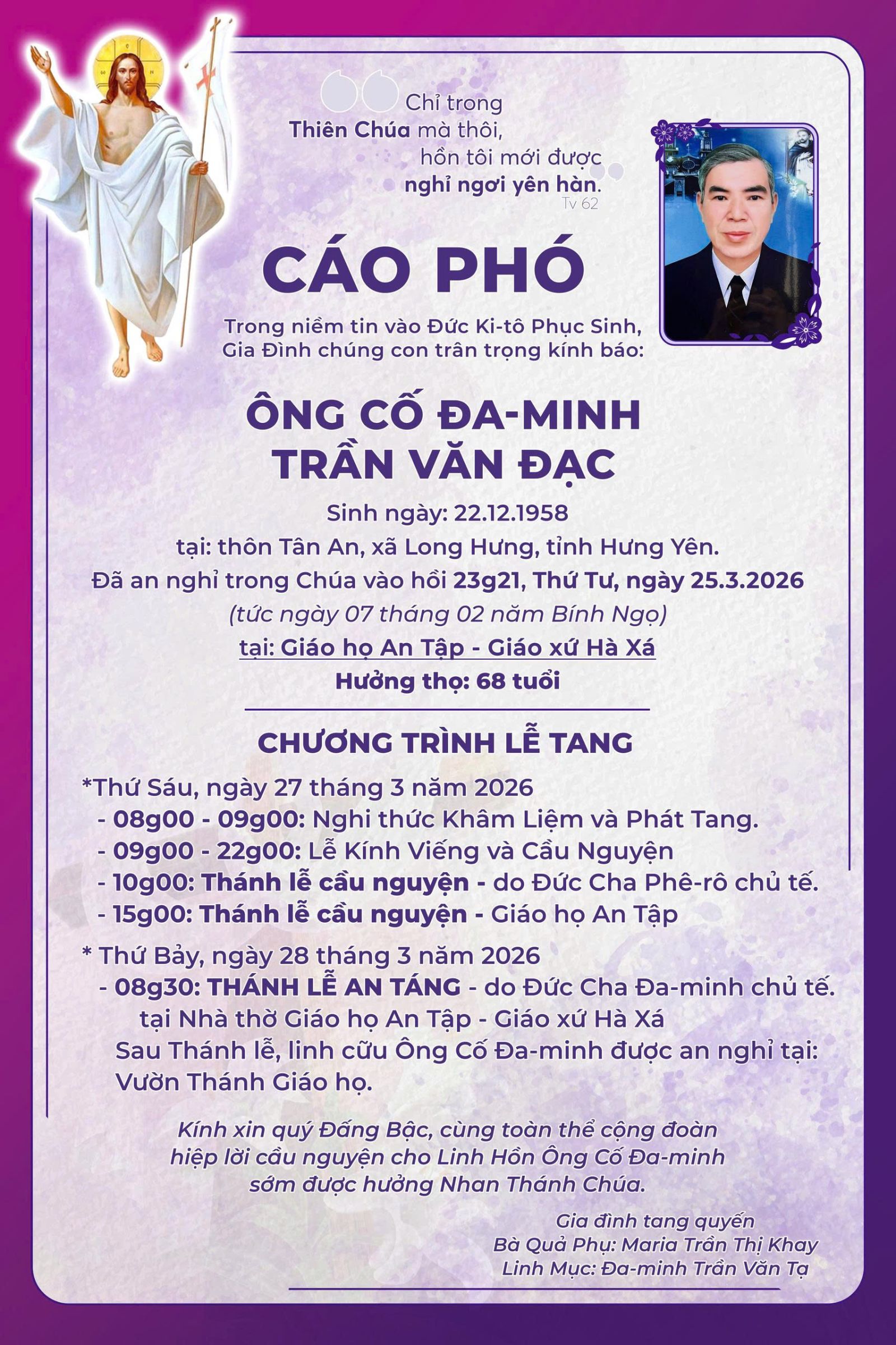 Trong niềm tin và hy vọng vào Chúa Ki-tô Phục Sinh, gia đình chúng con xin kính báo: Ông Cố Đa Minh Trần Văn Oanh, sinh năm 1969 tại Giáo xứ Đông Châu, đã được Chúa gọi về hồi 13g20 ngày 03/3/2026 (tức ...
