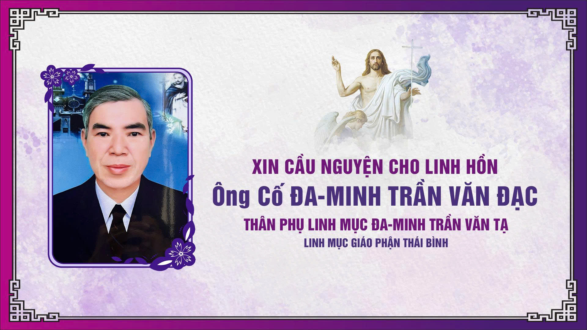 Trong niềm tin vào Chúa Ki-tô Phục Sinh, gia đình chúng con xin kính báo: Ông Cố Phê-rô Trần Ngọc Huân – sinh ngày 01/01/1955, tại Giáo xứ Bồng Tiên, thôn Nam Tiên, xã Vũ Tiên, tỉnh Hưng Yên; đã hoàn tất ...