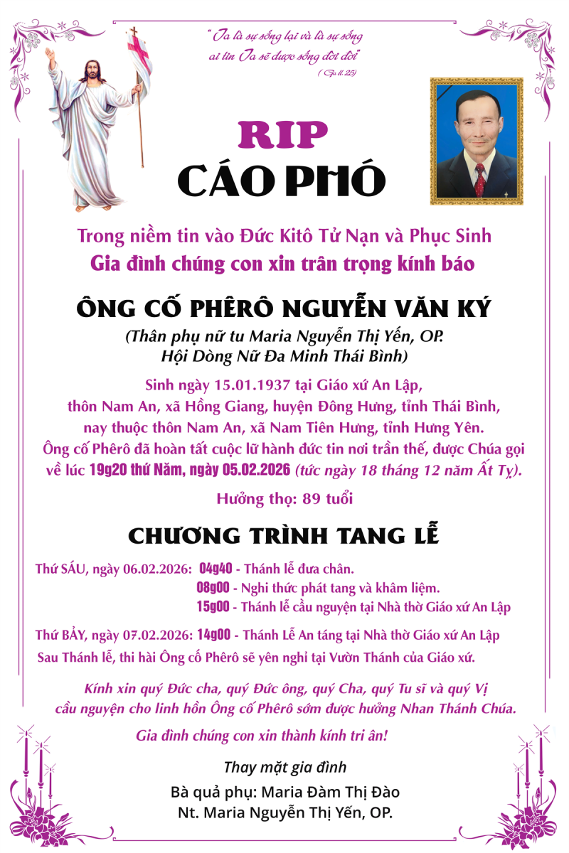 Trong niềm tin vào Chúa Ki-tô Phục Sinh, gia đình chúng con xin kính báo: Ông Cố Phê-rô Trần Văn Cừ – sinh năm 1961, thường trú tại thôn Thái Sa, xã Thư Vũ, tỉnh Hưng Yên; đã an nghỉ trong Chúa hồi 04g30 ...