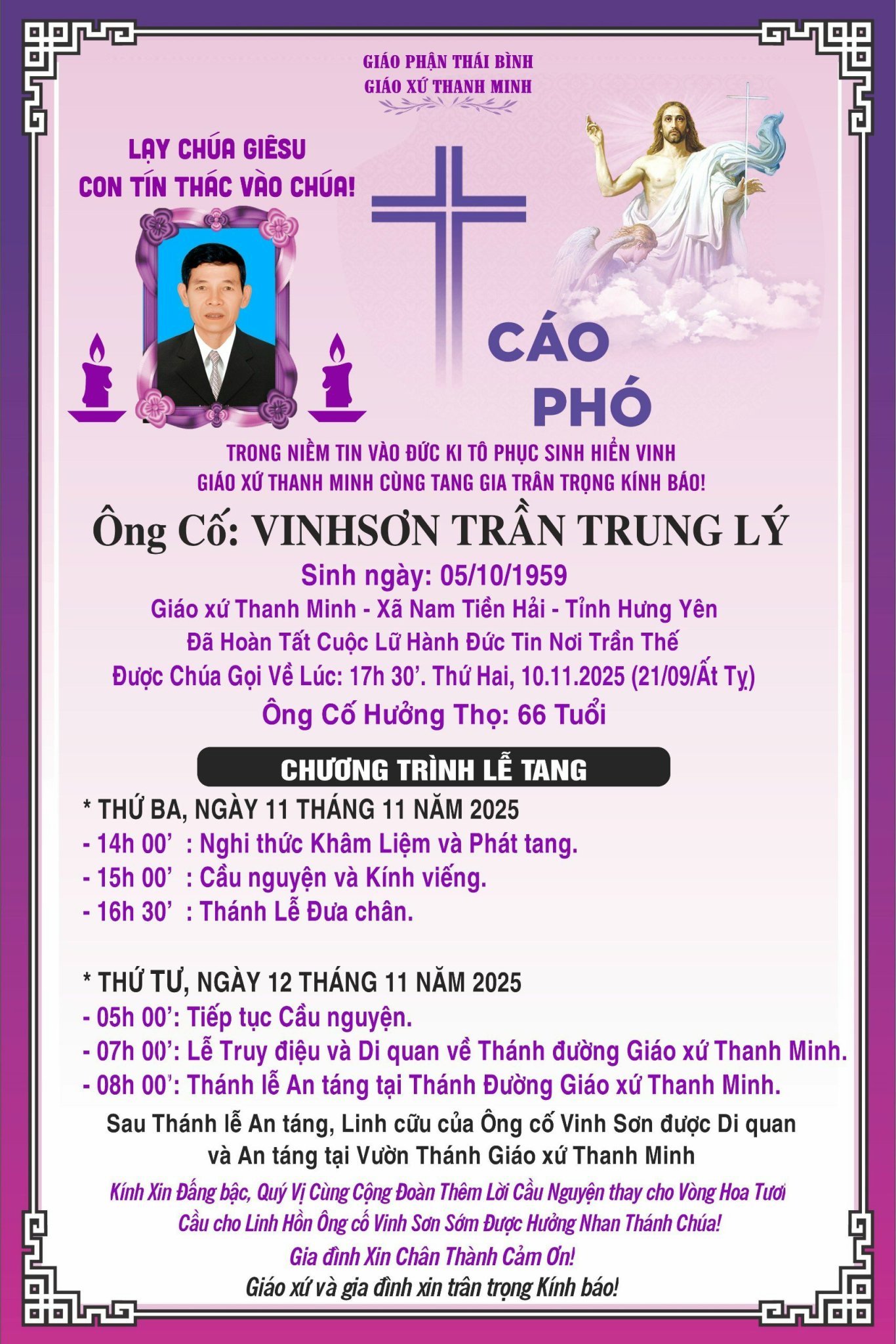 Ông cố Vinh Sơn - Thân phụ nữ tu Maria Nguyễn Thị Kim Sen, OP. - thuộc Hội dòng Nữ Đa Minh Thái Bình đã được Chúa gọi về lúc 14g05 thứ Ba, ngày 29.7.2025. Thánh lễ An táng được cử hành lúc 08g00 thứ Năm, ...