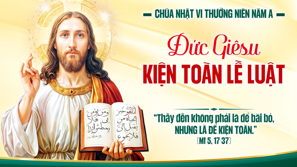 Khi ấy, Chúa Giêsu phán cùng các môn đệ rằng: "Các con đừng tưởng Ta đến để huỷ bỏ lề luật hay các tiên tri; Ta không đến để huỷ bỏ, nhưng để kiện toàn. Vì Ta bảo thật các con: Cho dù trời đất có qua đi, thì một chấm, một phẩy trong bộ luật cũng không bỏ sót, cho đến khi mọi sự hoàn thành. Bởi vậy, ai huỷ bỏ một trong những điều luật nhỏ mọn nhất và dạy người khác làm như vậy, sẽ kể là người nhỏ nhất trong Nước Trời; trái lại, ai giữ và dạy người ta giữ những điều đó, sẽ được kể là người cao cả trong Nước Trời. Nếu các con không công chính hơn các luật sĩ và biệt phái, thì các con chẳng được vào Nước Trời đâu. "Các con đã nghe dạy người xưa rằng: 'Không được giết người. Ai giết người, sẽ bị luận phạt nơi toà án'. Còn Ta, Ta bảo các con: Bất cứ ai phẫn nộ với anh em mình, thì sẽ bị toà án luận phạt. Ai bảo anh em là 'ngốc', thì bị phạt trước công nghị. Ai rủa anh em là 'khùng', thì sẽ bị vạ lửa địa ngục. Nếu ngươi đang dâng của lễ nơi bàn thờ mà sực nhớ người anh em đang có điều bất bình với ngươi, thì ngươi hãy để của lễ lại trước bàn thờ, đi làm hoà với người anh em ngươi trước đã, rồi hãy trở lại dâng của lễ. Hãy liệu làm hoà với kẻ thù ngay lúc còn đi dọc đường với nó, kẻo kẻ thù sẽ đưa ngươi ra trước mặt quan toà, quan toà lại trao ngươi cho tên lính canh và ngươi sẽ bị tống ngục. Ta bảo thật các ngươi biết: Ngươi sẽ không thoát khỏi nơi ấy cho đến khi trả hết đồng bạc cuối cùng. "Các con đã nghe nói với người xưa rằng: 'Chớ ngoại tình'. Còn Ta, Ta bảo các con: Hễ ai nhìn xem phụ nữ mà ước ao phạm tội với họ, thì đã ngoại tình với họ trong lòng rồi. Nếu con mắt phải của con nên dịp tội cho con, thì hãy móc nó mà ném xa con; vì thà mất một chi thể còn lợi hơn là toàn thân bị ném vào hoả ngục. Và nếu tay phải con nên dịp tội cho con, thì hãy chặt mà ném nó xa con; vì thà mất một chi thể còn hơn là toàn thân bị ném vào hoả ngục. "Cũng có lời dạy rằng: 'Ai ly dị vợ mình, thì hãy trao cho vợ tờ ly dị'. Còn Ta, Ta bảo các con: Hễ ai ly dị vợ mình, trừ trường hợp tà dâm, thì làm cớ cho vợ ngoại tình; và ai cưới người vợ đã ly dị, cũng phạm tội ngoại tình. "Các con cũng đã nghe có lời bảo người xưa rằng: 'Chớ thề gian, nhưng hãy giữ trọn lời mình thề với Chúa'. Còn Ta, Ta bảo các con: Đừng thề chi cả; đừng lấy trời mà thề, vì trời là ngai Thiên Chúa; đừng lấy đất mà thề, vì đất là bệ chân Người; đừng lấy Giêrusalem mà thề, vì là thành của Vua cao cả. cũng đừng chỉ đầu ngươi mà thề, vì ngươi không thể làm cho một sợi tóc ra trắng hay đen được. Nhưng lời nói của các con phải là: Có thì nói có, không thì nói không, thêm điều đặt chuyện là bởi ma quỷ mà ra".